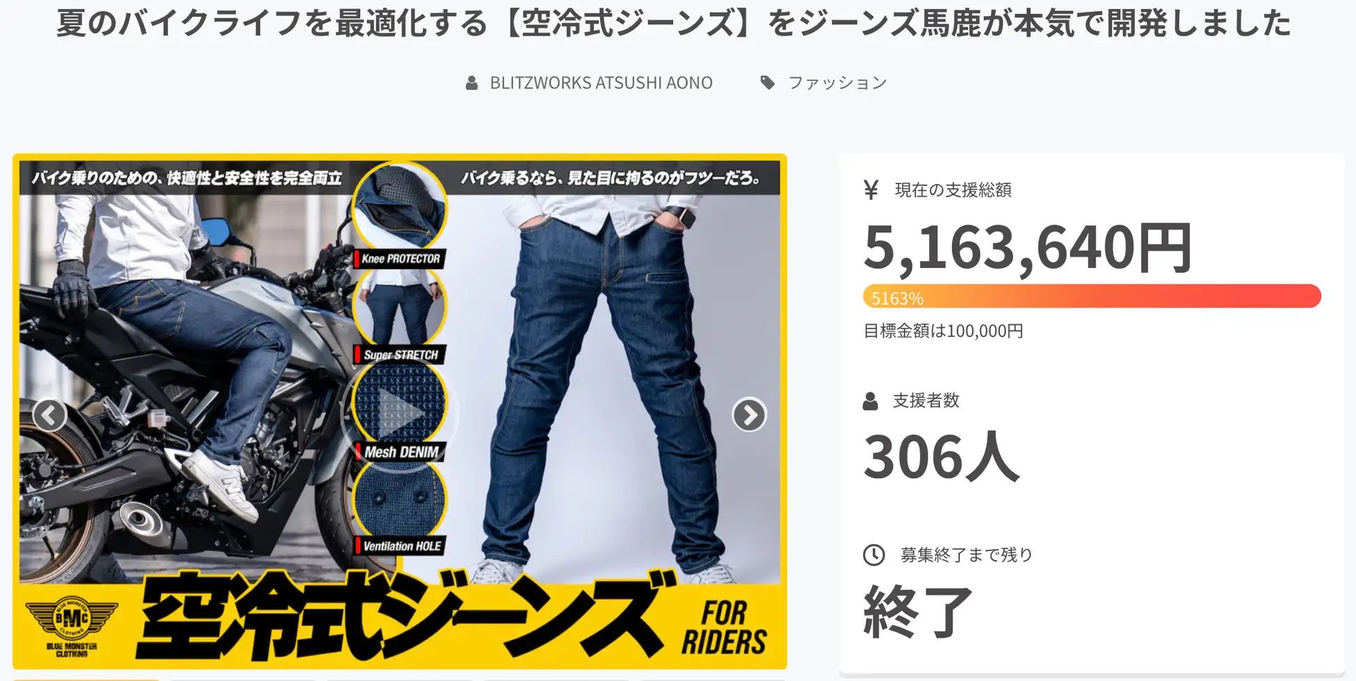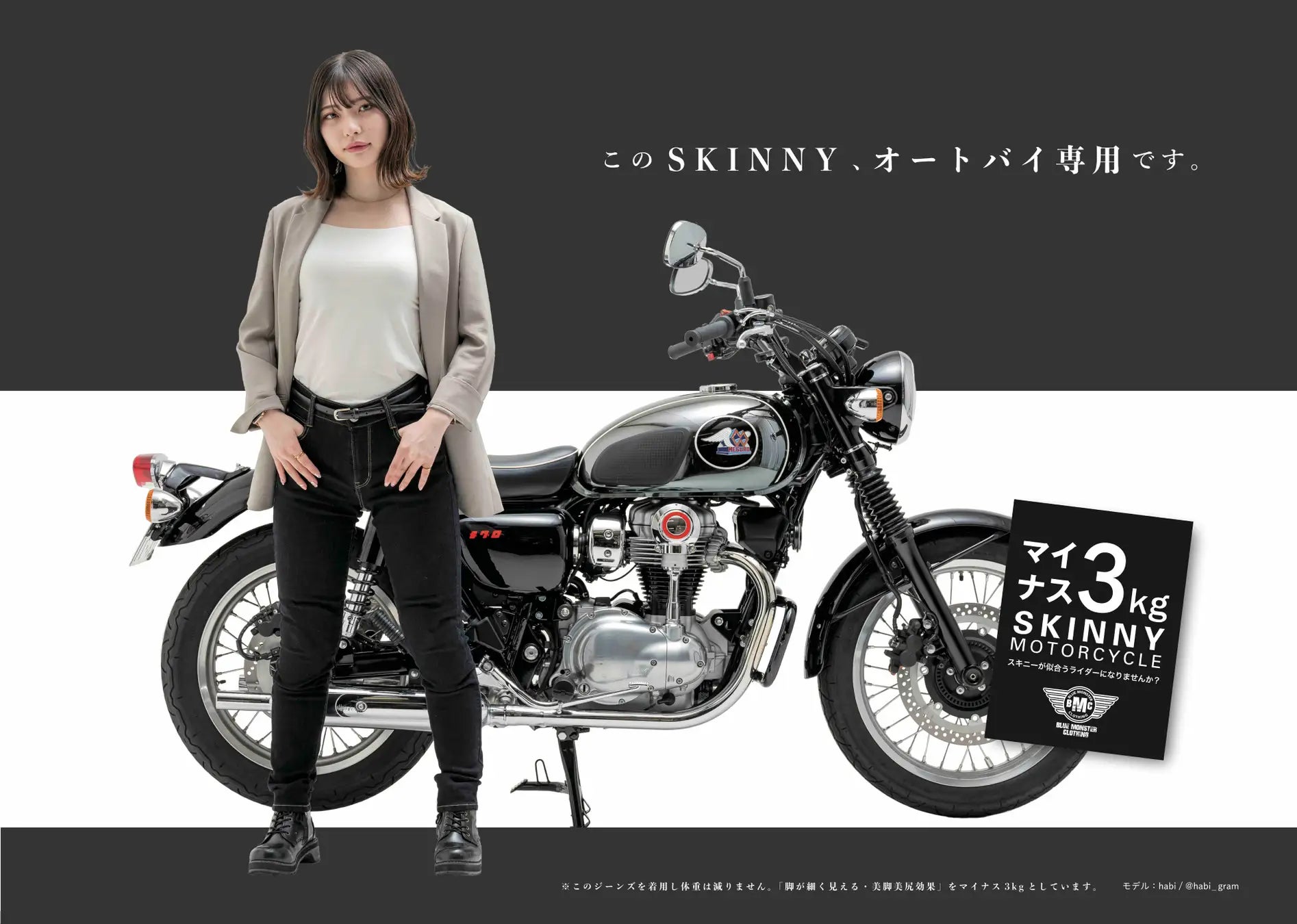 BMCは代表の青野が、YouTube【ローリー青野の10 MILE BIKE LIFE】にてアパレル・バイク製品の開発を進めていくユニークな手法を採用。クラウドファンディングで500万円以上を集めた「空冷式ジーンズ」や、バイク用品販売チェーンの「2りんかん」独占販売アイテムを展開するなど、バイク衣料品市場でその存在感を急激に高めているブランドです。