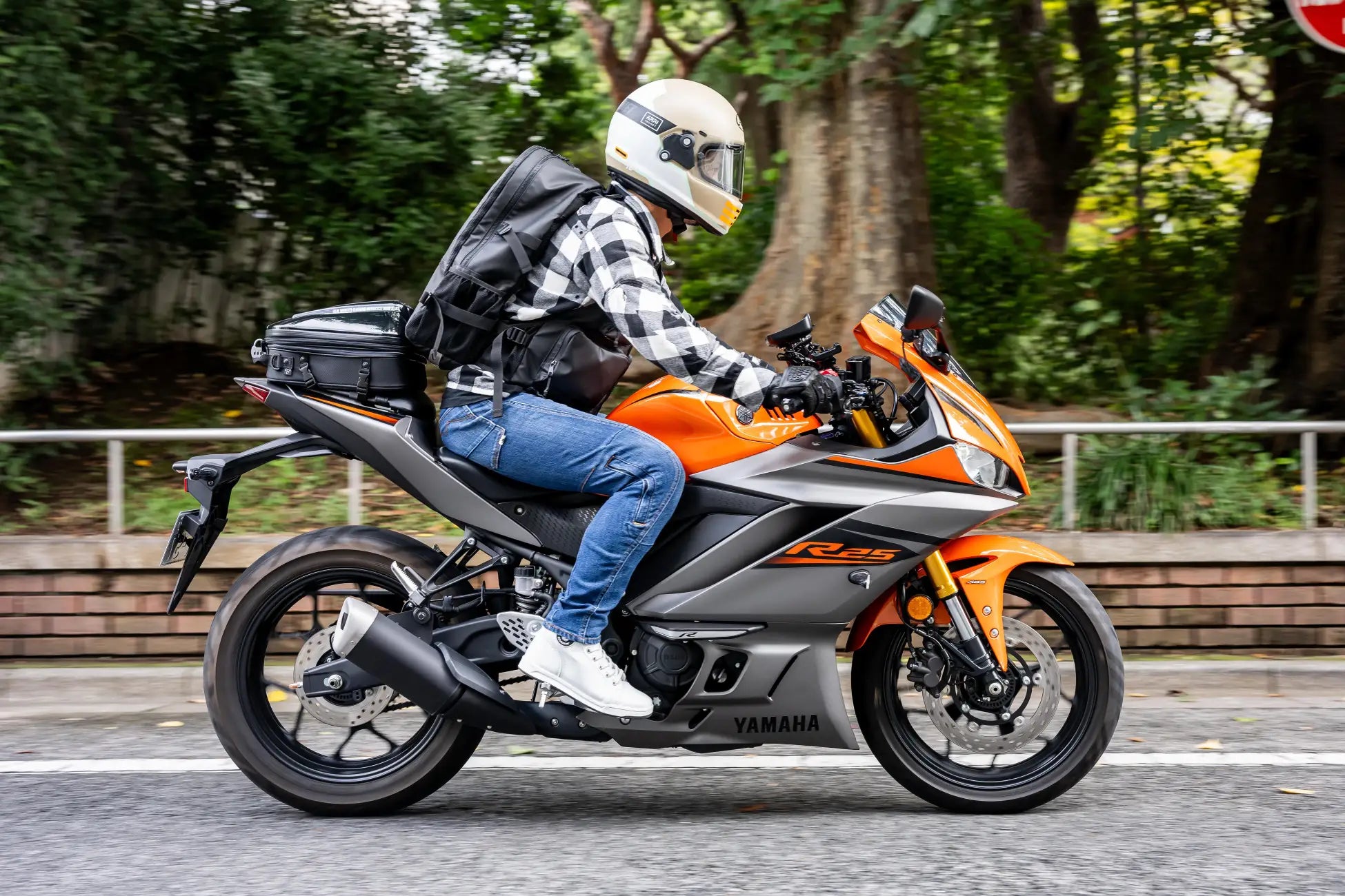 容量25Lのリュックは、シートバッグを取り付けたバイクに乗車してもリュックがシートバッグに干渉せず快適なライディングが可能です。積載量がないバイクでも、このリュックを使用すると沢山の荷物を運ぶことが出来ます。