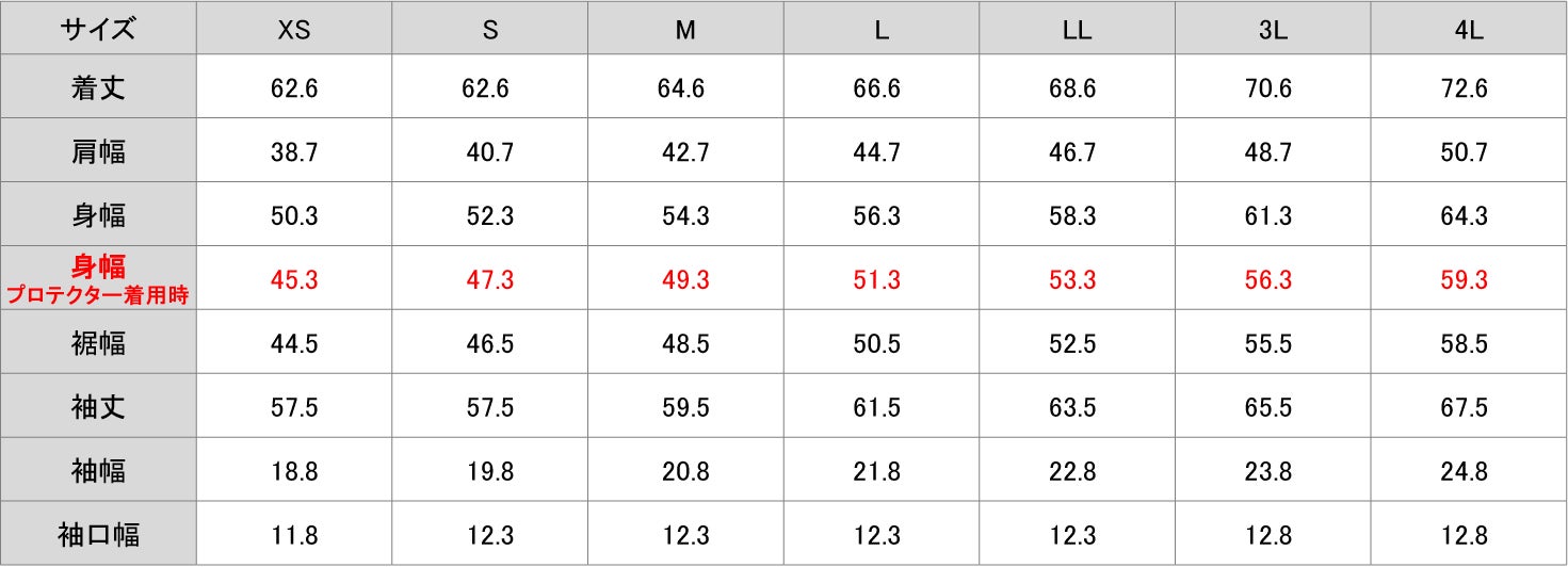 *身幅は、表内赤字 「身幅 プロテクター着用時」の寸法をご参考にして下さいませ。