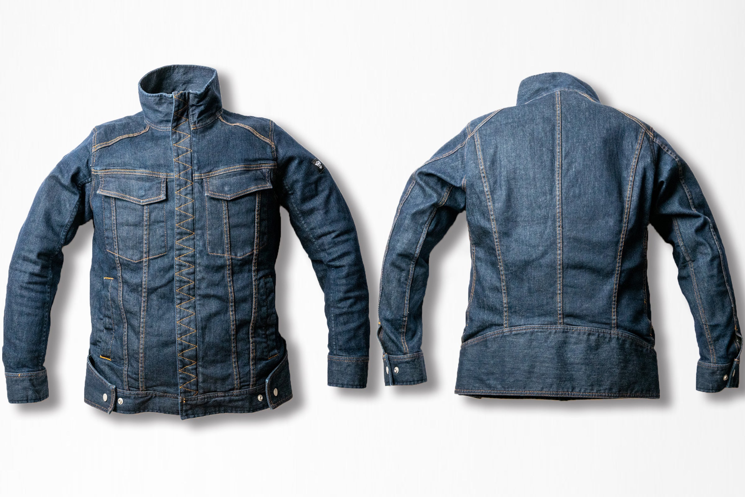 肘が若干曲がった状態でハンドルを握りますよね。【ライダー専用デニムジャケット】の左右の袖は、腕を前に伸ばして肘を若干曲げた状態がデフォルトされています。だから、違和感なく腕を伸ばしてハンドルを握る事ができます。本当に肘周りのダボつきも無く、肘の突っ張りも無いですよ!これも上出のジーンズと同様に立体的な腕に最適化された袖の設計になっています。