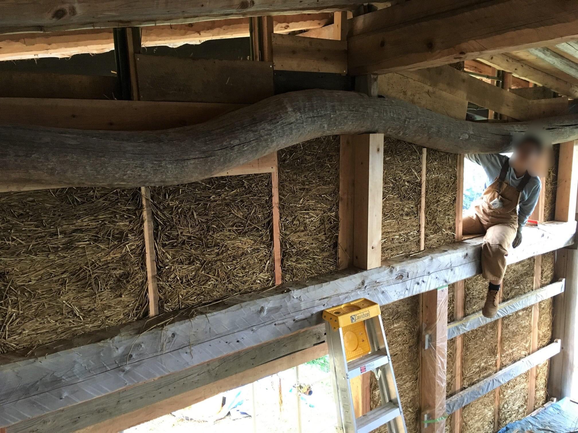 写真のように藁をブロックにして積んだ物を外側から左官仕上げをすることで完成します。