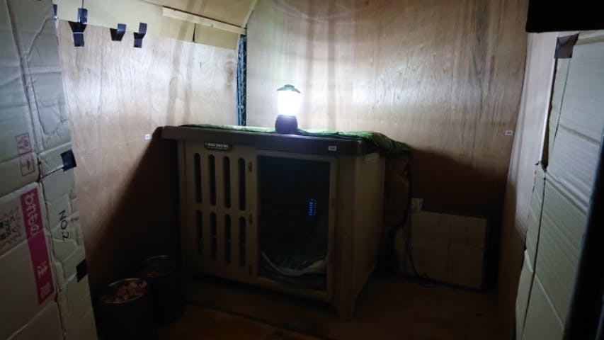 犬小屋を、寝袋で包むようにし、犬小屋にも、すきま風が入らないようにしました。