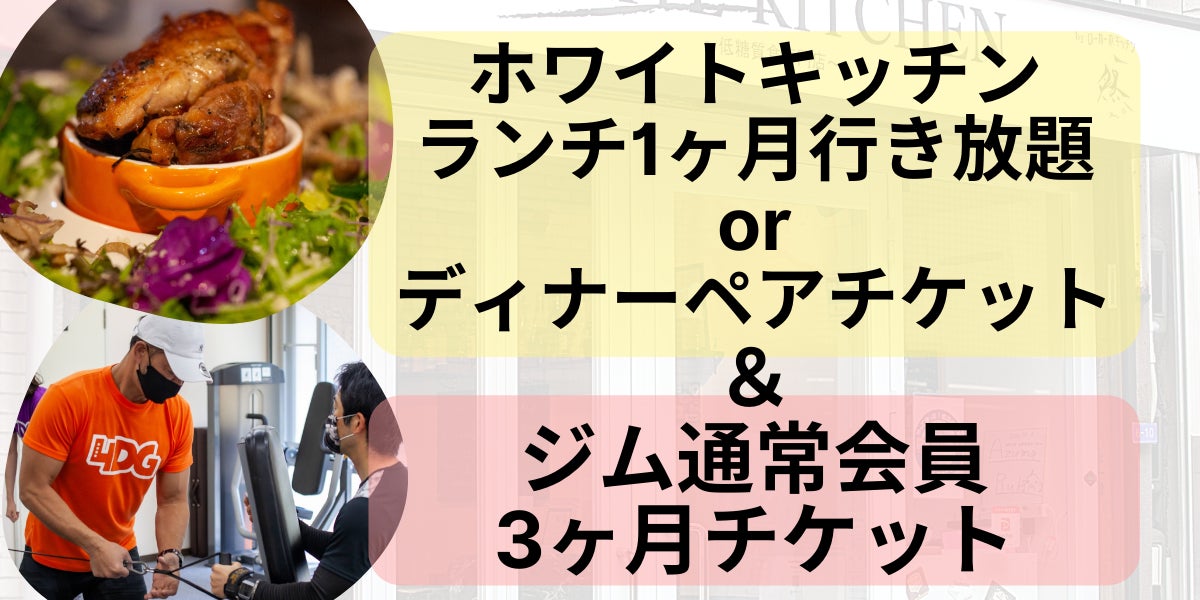 ・ジム通常会員3ヶ月券+ホワイトキッチンランチ1ヶ月チケットorディナーペアチケット→20,000円