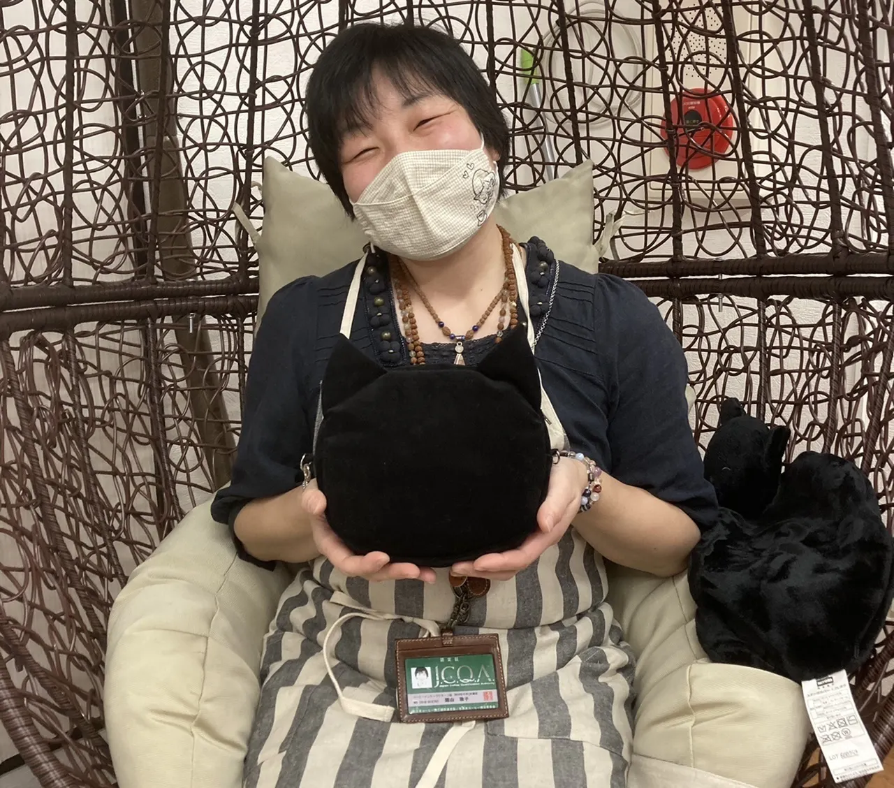 皆さんこんばんは!Meemee Cafe店主の園山敦子です。愛用の椅子『人間をダメにする椅子』にて開店祝いにいただいたエプロンと、開店祝いに頂いたニャンコのポーチを抱えてニンマリ♪皆様差し入れのお菓子やお花など、本当にありがとうございます。