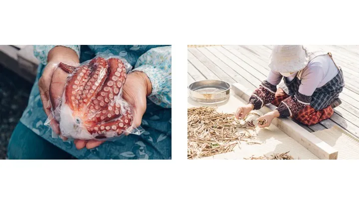 パウチして冷凍した新鮮なタコ・ばあちゃんたちが日向で小豆を干す風景はずっと眺めていたくなる