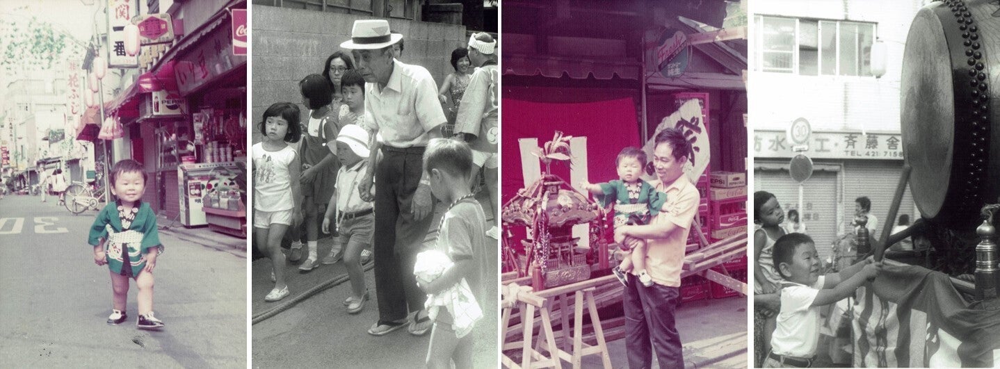 一番左から。店舗前から北方向が写っています。一番さん、花ふじさん→オルガさん、表通りに出ていたころの一二三さんの看板も見えます/白黒写真の帽子の男性が祖父/神輿の奥がかつての母屋。私を抱っこしているのは私ではなく父です/奥がいま山下書店さんの建物。当時の松陰神社通りは一方通行ではなかったことが標識の向きでわかります。