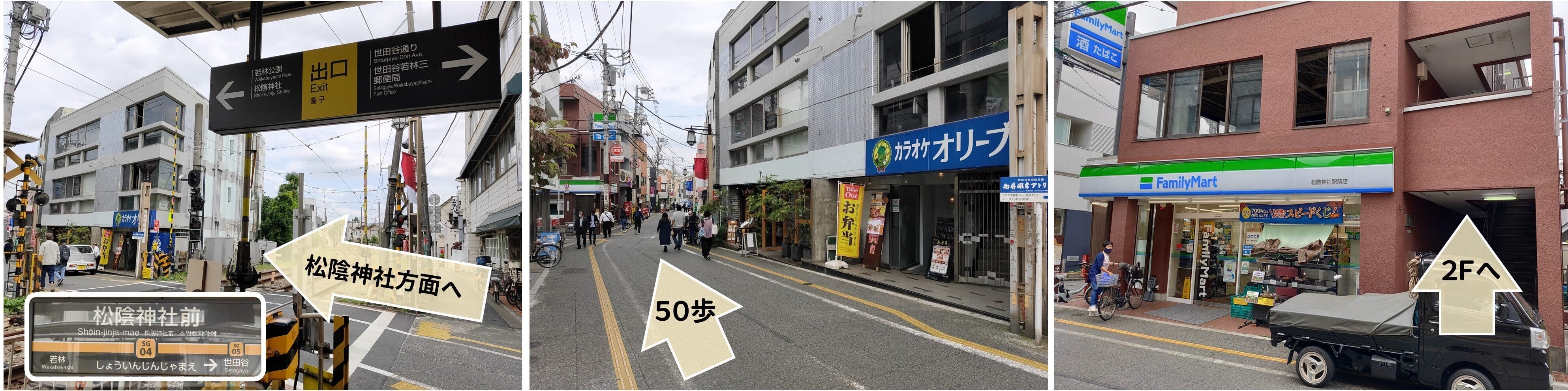 世田谷線松陰神社前駅を降り、松陰神社方向に50歩。1Fにファミリーマートのある赤茶色の建物「コーナー松陰」の2Fが今回のプロジェクトのフィールドです。