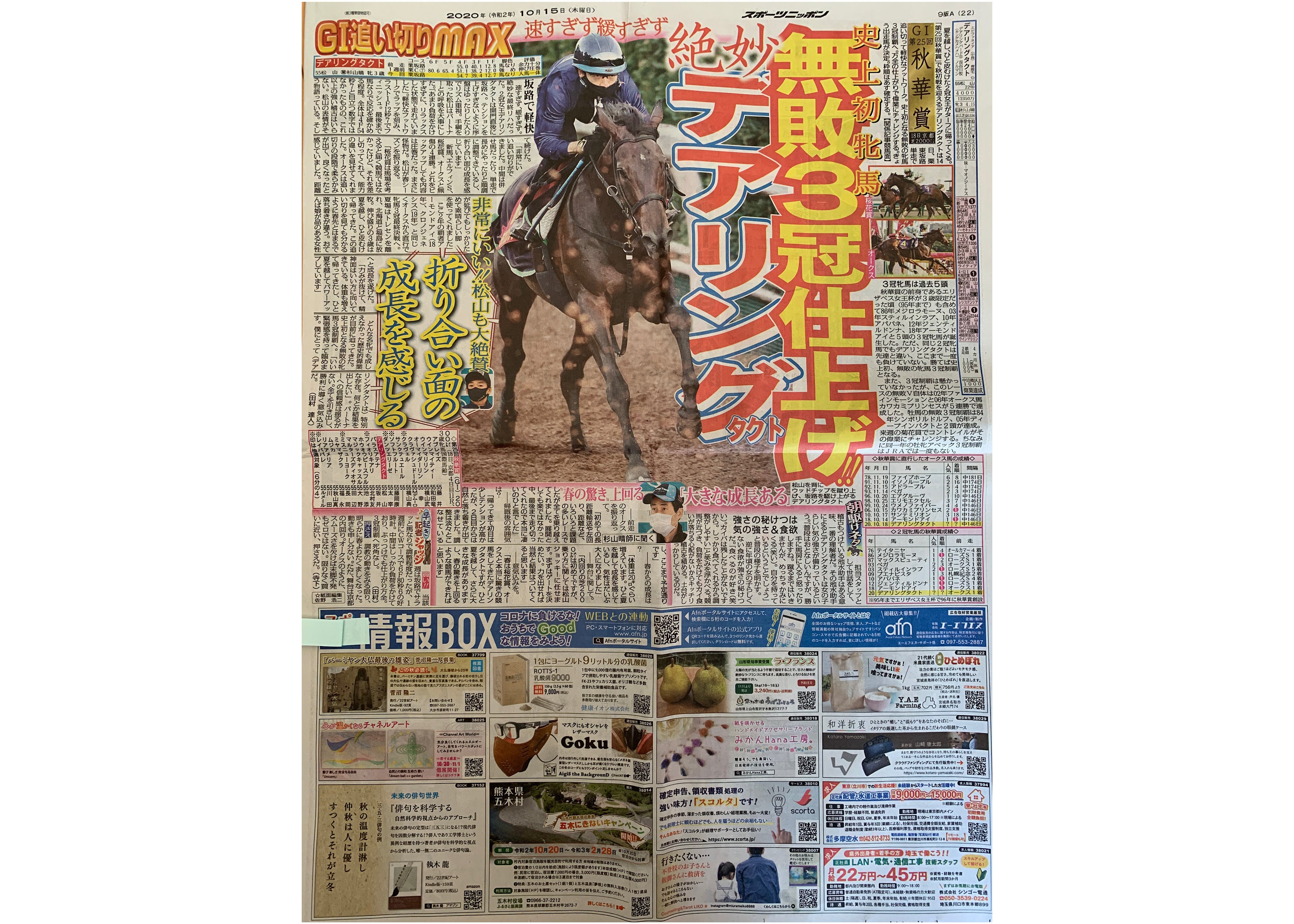 先週10月15日(木)のスポーツニッポン新聞裏面に掲載頂きました!