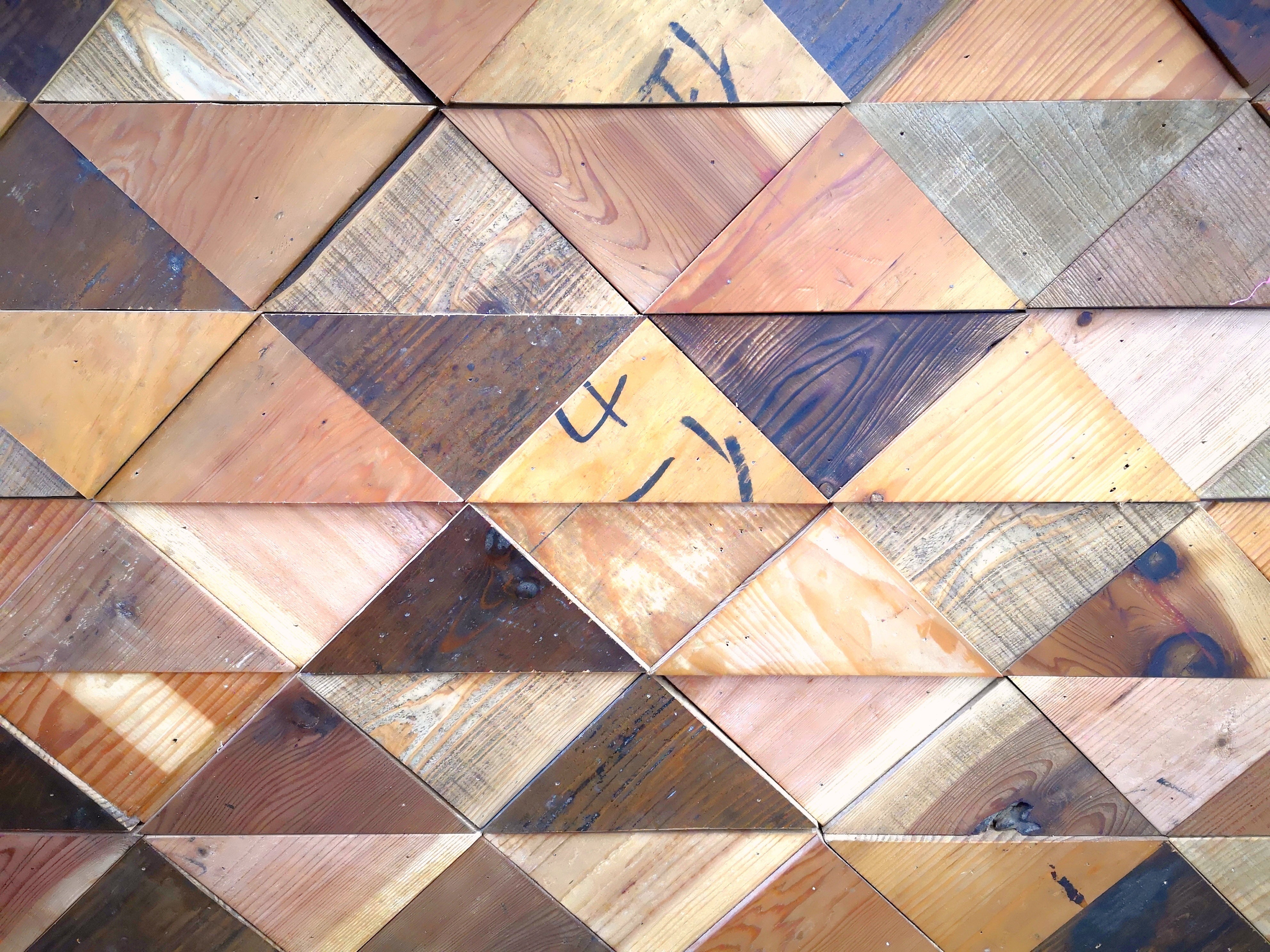 この鱗板は全て、取り壊される空き家で床などに使われていた廃材を利用しています。