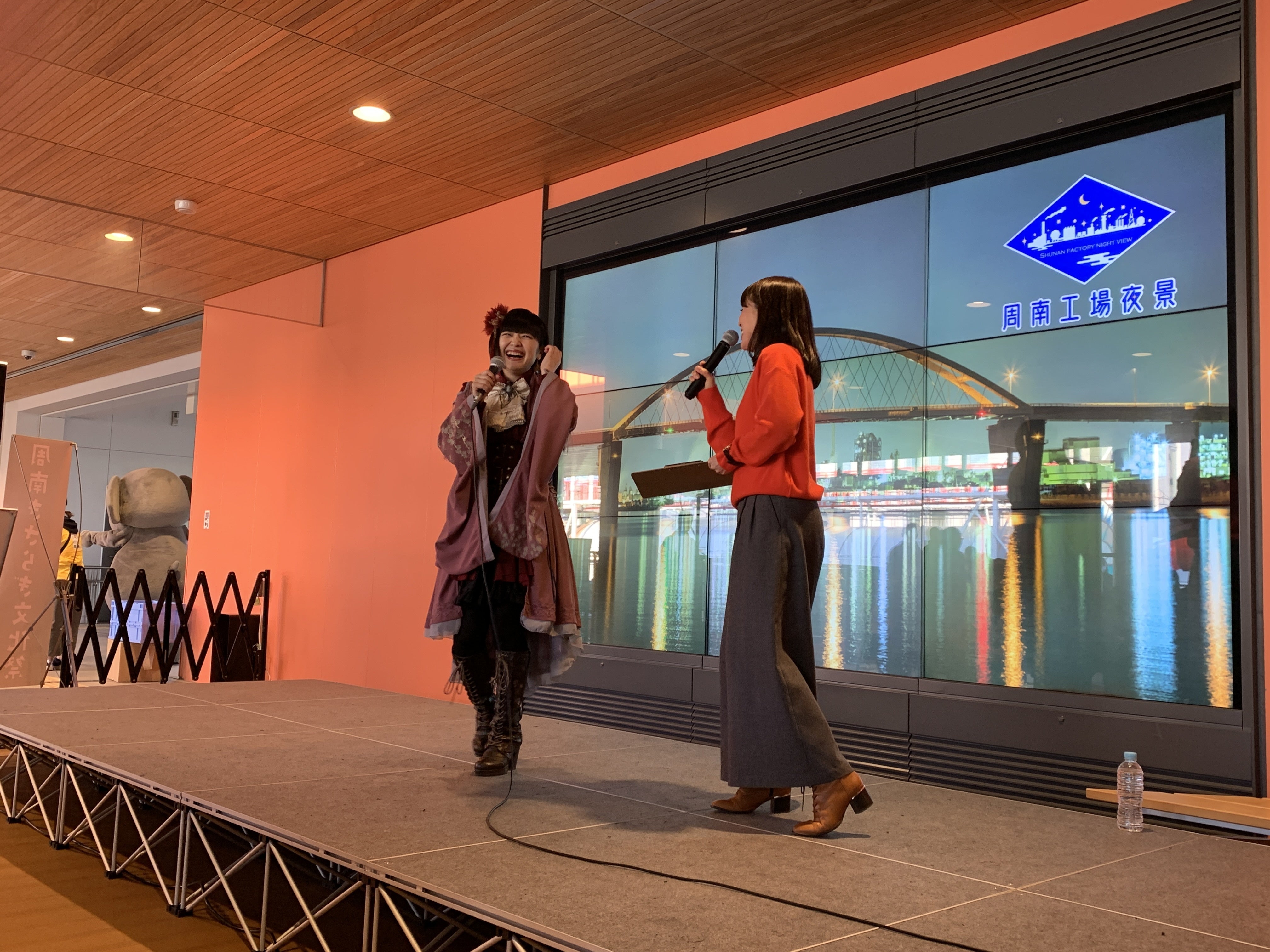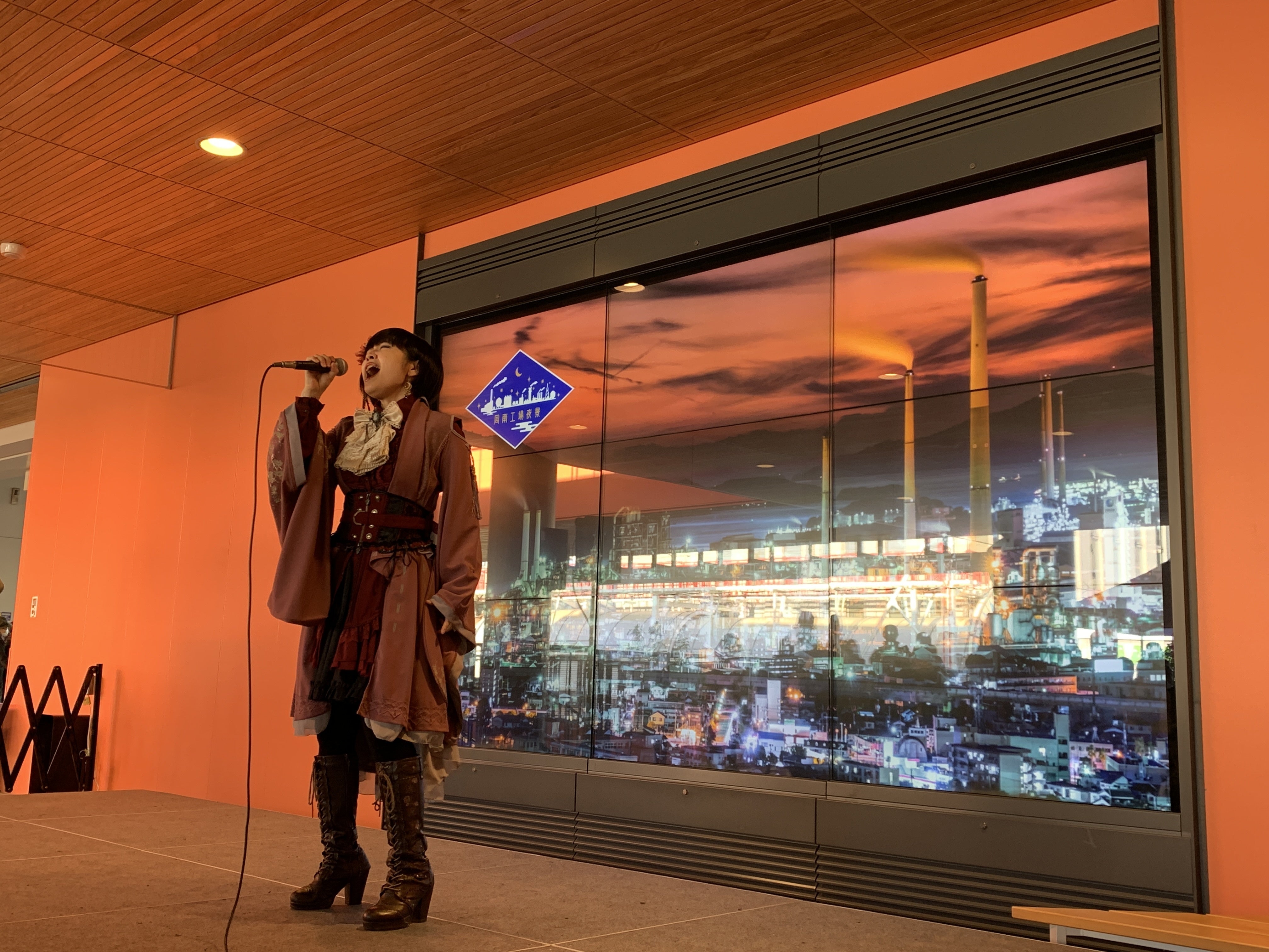 その時に周南市の観光資源でもある工場夜景と小林さんを繋げることが出来れば、ファンにも知ってもらえる機会になるのでは、と思い、2017年の「工場夜景の日イベント」(毎年2/23)にゲスト出演。そこから今年の2月も4年連続で出演していただきました(写真は2020年の駅前図書館でのライブの様子)。