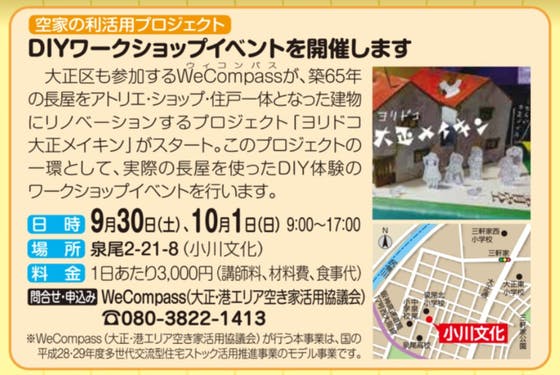 大正区で毎月発行され、各戸に配布されている区民だより「こんにちは大正」の9月号の表紙にて、9月30日、10月1日の週末nに開催するDIYワークショップイベントをご紹介くださっています!