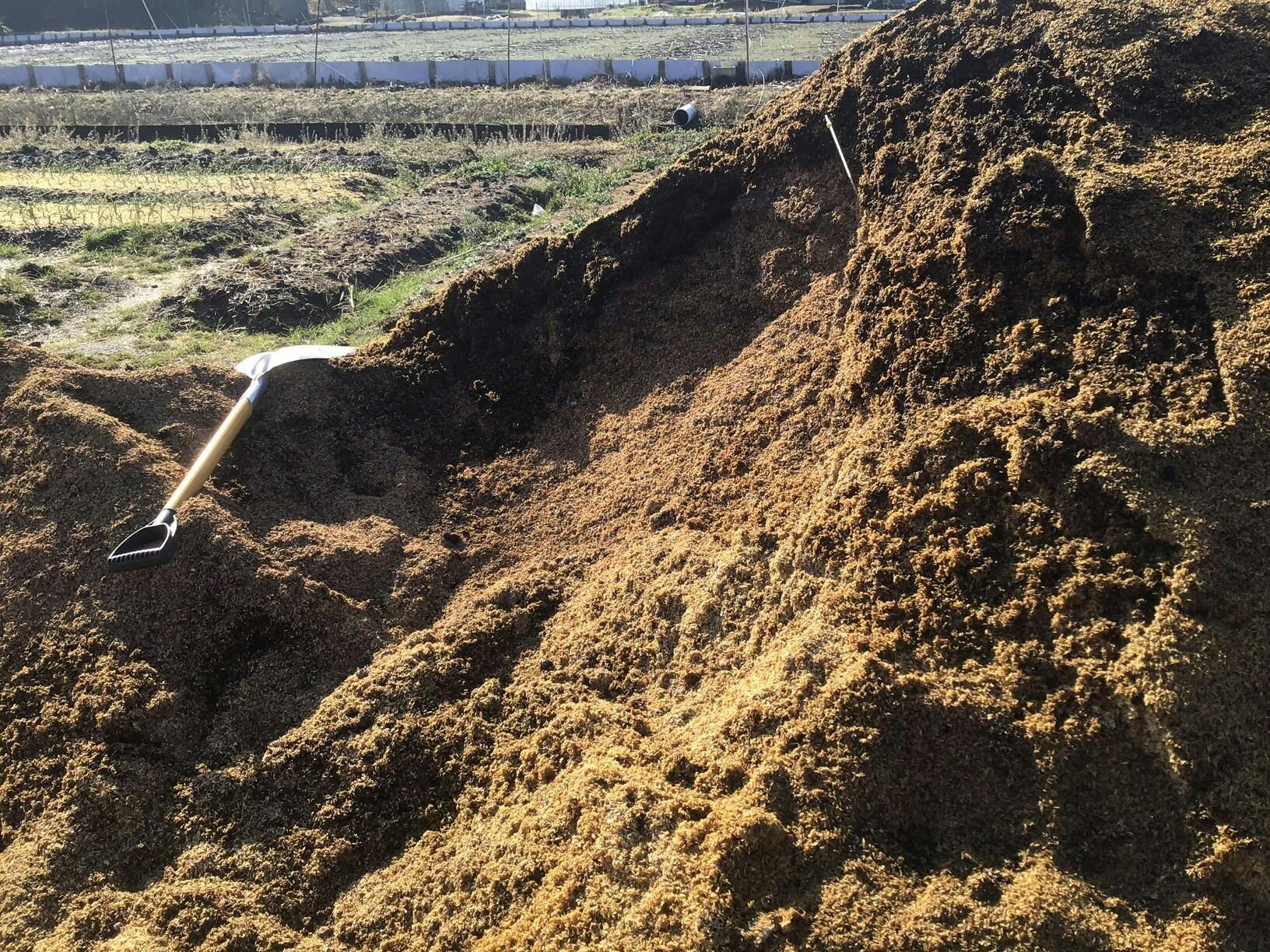 今日は籾殻発酵堆肥の切り返し作業をしました。堆肥の温度も人との好適体温である36.5度前後です。ジワーッと適温で微生物さんも活動して発酵中です。もう使えます。そろそろ畑に漉き込む作業ができます。