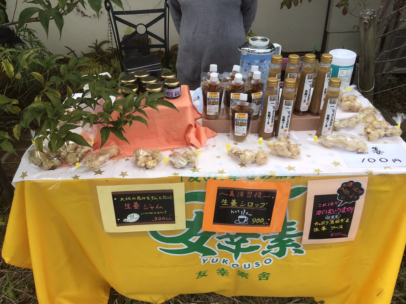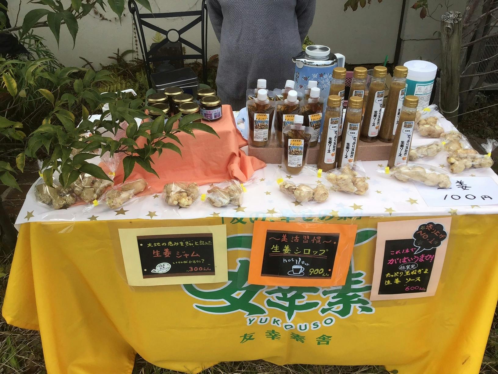 今日は、ご近所のアスパラ農家さんが主導されている対面販売佐賀んメルカートにお誘いを受け始めて参加しました。生姜シロップを試飲していただくと、「美味しい」と返ってくる声がとても嬉しいですね。励みになります。