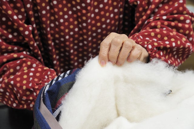 1枚1枚手作業でわたを入れ、1針1針手縫いで仕上げるたいへん手間のかかる商品です。