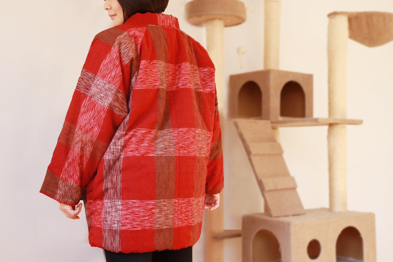 『ねん猫はんてん』はNECO LABOの完全オリジナル商品で、冬につきものの静電気のストレスを軽減できるよう、生地も中綿も綿100%で制作しています。