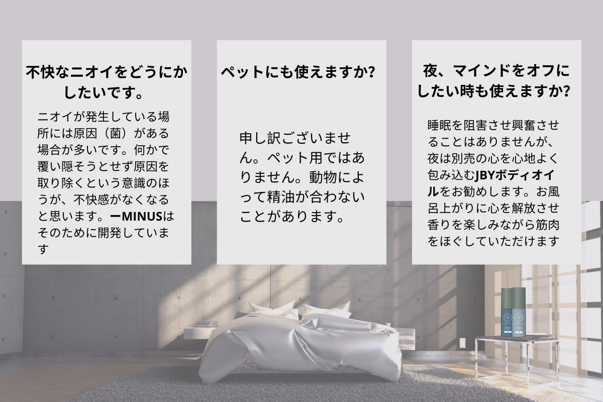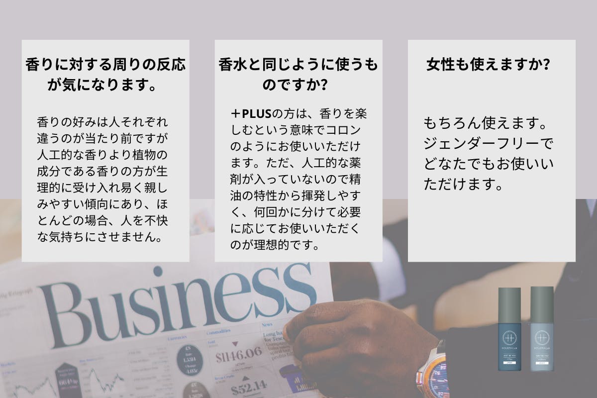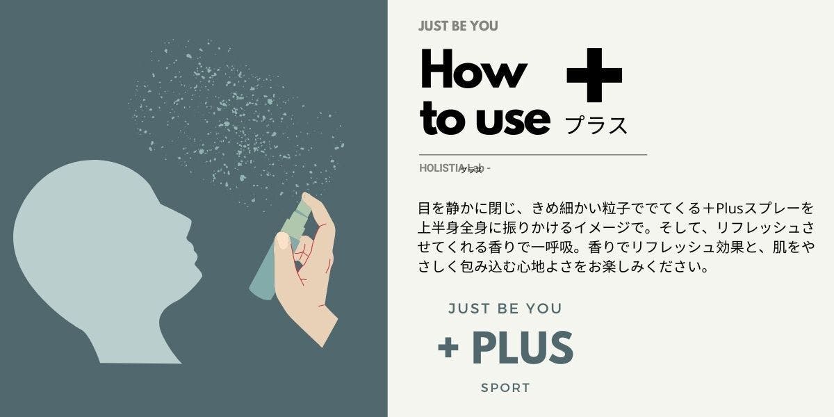 使い方: 目を静かに閉じ、きめ細かい粒子ででてくる+PLUSスプレーを上半身に振りかけるイメージで、香りのバリアで包み込む。そして、リフレッシュさせてくれる香りで一呼吸。香りでリフレッシュ効果と、肌をやさしく包み込む心地よさをお楽しみください。マスクに振りかけることで、マスクの中も天然の香りでリフレッシュできます。