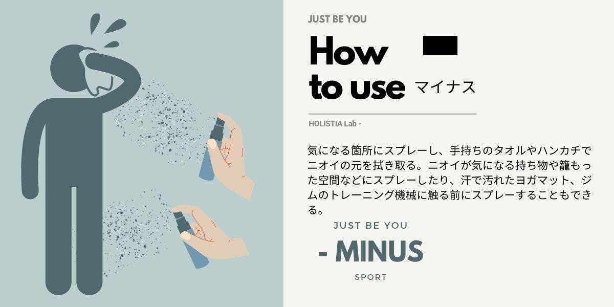 ジャストビーユー ーMINUS <SPORT>は、気になる臭い(加齢臭、頭の臭い、靴の臭い)を取り除く、拭き取り用スプレーです。嫌な臭いだけがなくなることで、散漫になる意識を集中させます。体の気になる箇所にスプレーして、手持ちのタオルやハンカチで臭いの元を拭き取ったり、臭いがきになる持ち物やこもった空気の空間などにスプレーできます。 50mL