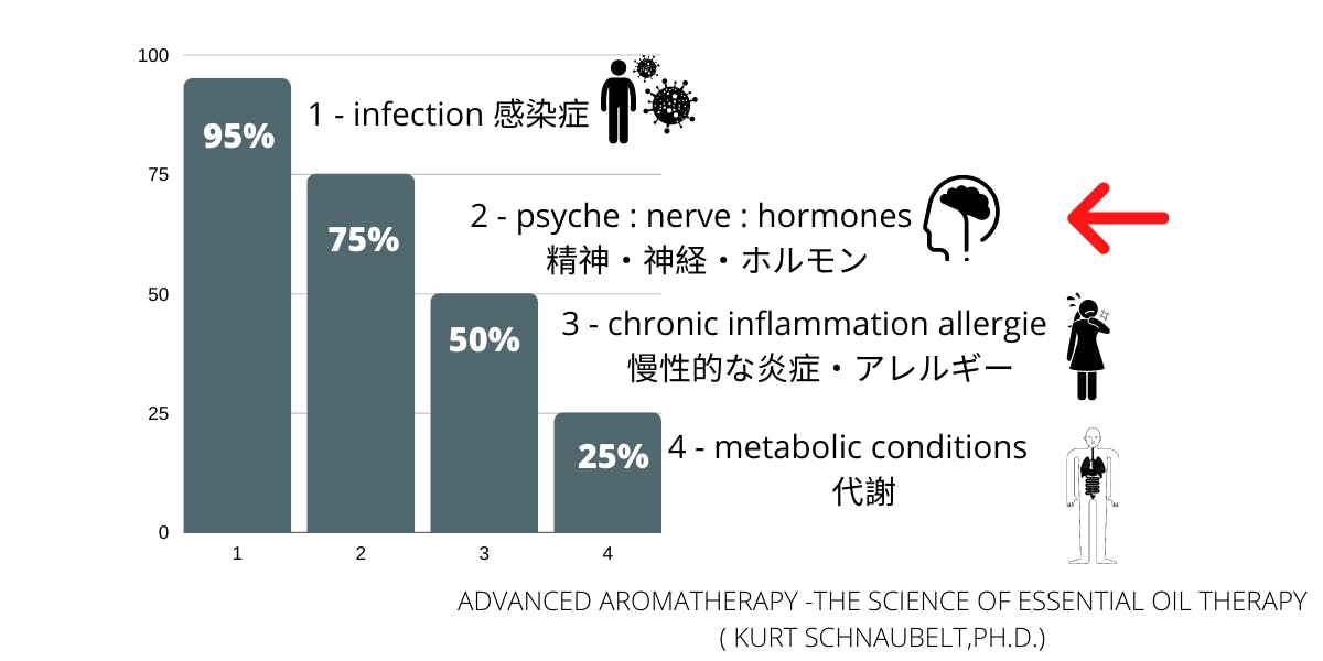そして、化学者である Ph.D Kurt Schnaubelt著者『Advance AROMATHERAPY 』によると、アロマセラピー(精油を使った療法)を使った症状別の成功例の統計が記載されています。このグラフを見ると世界ではどのような時に精油が使われているかがわかります。