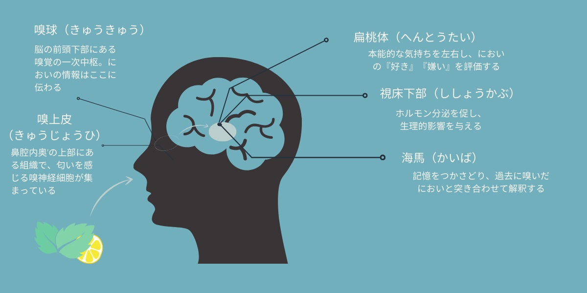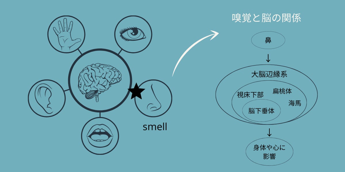 脳には、感情・本能を司る「大脳辺縁系」と、理性的な思考を司る「大脳新皮質」の二つがありますが、五感(視覚、聴覚、触覚、味覚、嗅覚)の中で唯一、匂いだけが感情・本能に関わる「大脳辺縁系」に直接伝達されます。