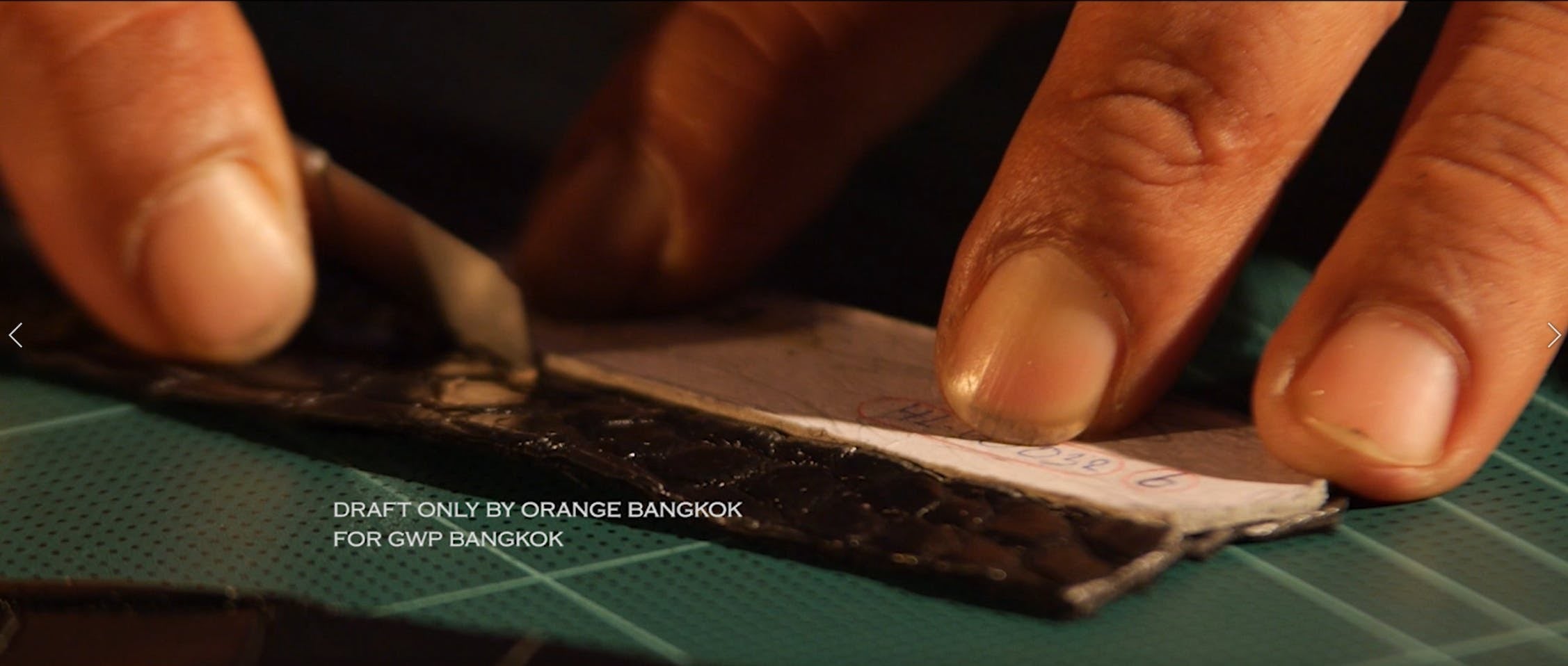 革の選別後、裁断工程に入ります。この際クロコダイルの斑模様が美しく映えるようミリ単位での裁断技術が要求されます。