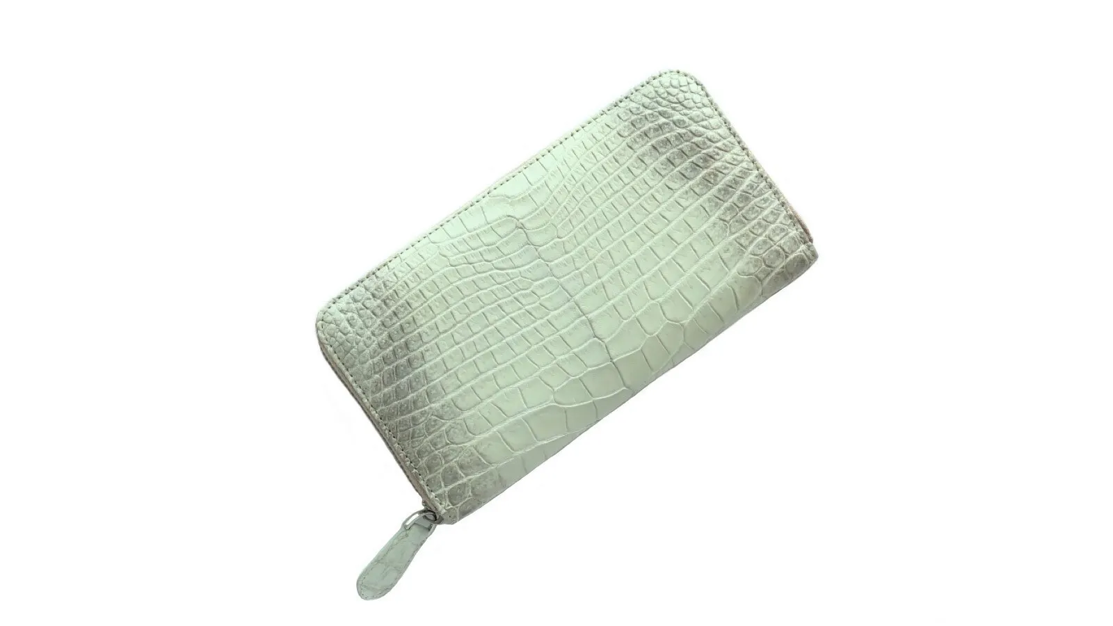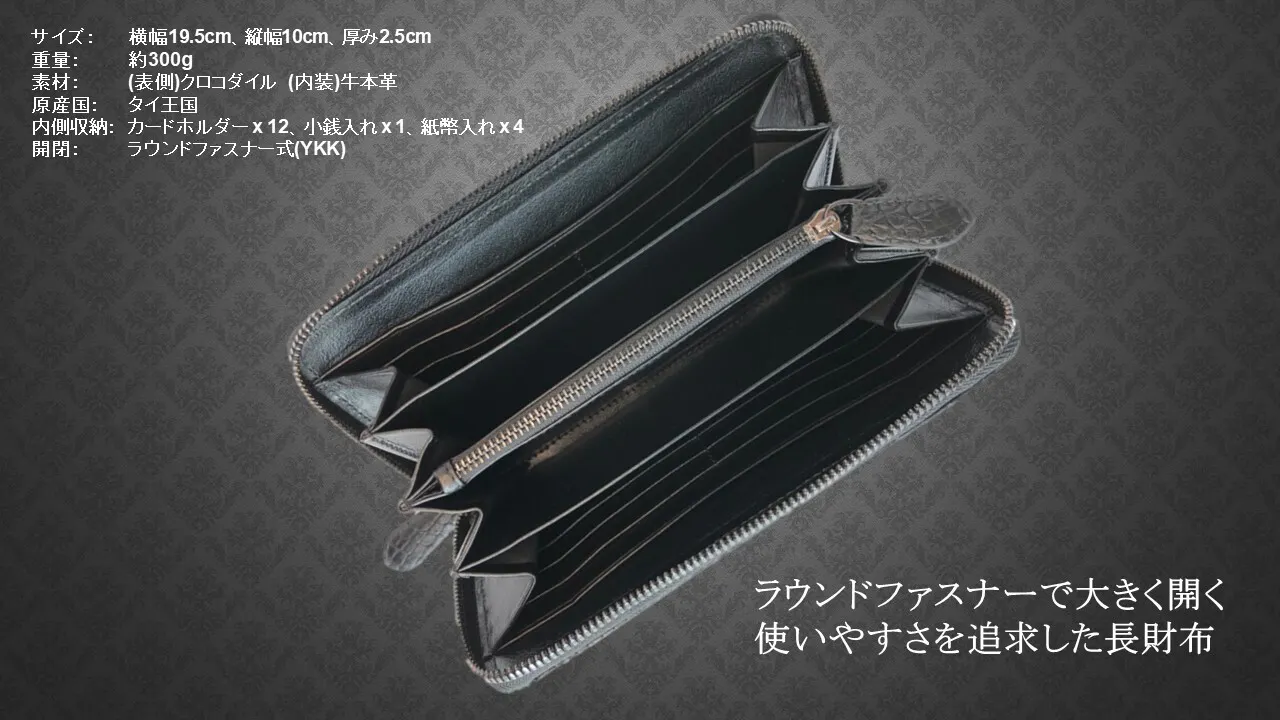 世界有数の有名ブランドがこぞって入手しているワニ革が存在し、それが上記の「シャムワニ」「ポロサス」です。 これらの革は強度だけでなく、天然のものとは思えないような均等に並んだ腑模様の美しさから、 『革のダイヤモンド』と称されるほどで、その中でも一番希少価値の高い部類に属するシャムワニの腹部を使用した長財布になります。