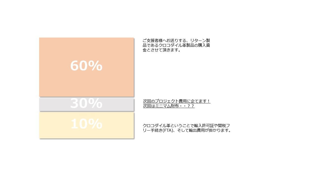 ご支援いただいた資金(目標額598,000円)を当製造工場におけるクロコダイル革製品のロット購入費用の一部とさせて頂きます。具体的な資金の使い道は以下になります。