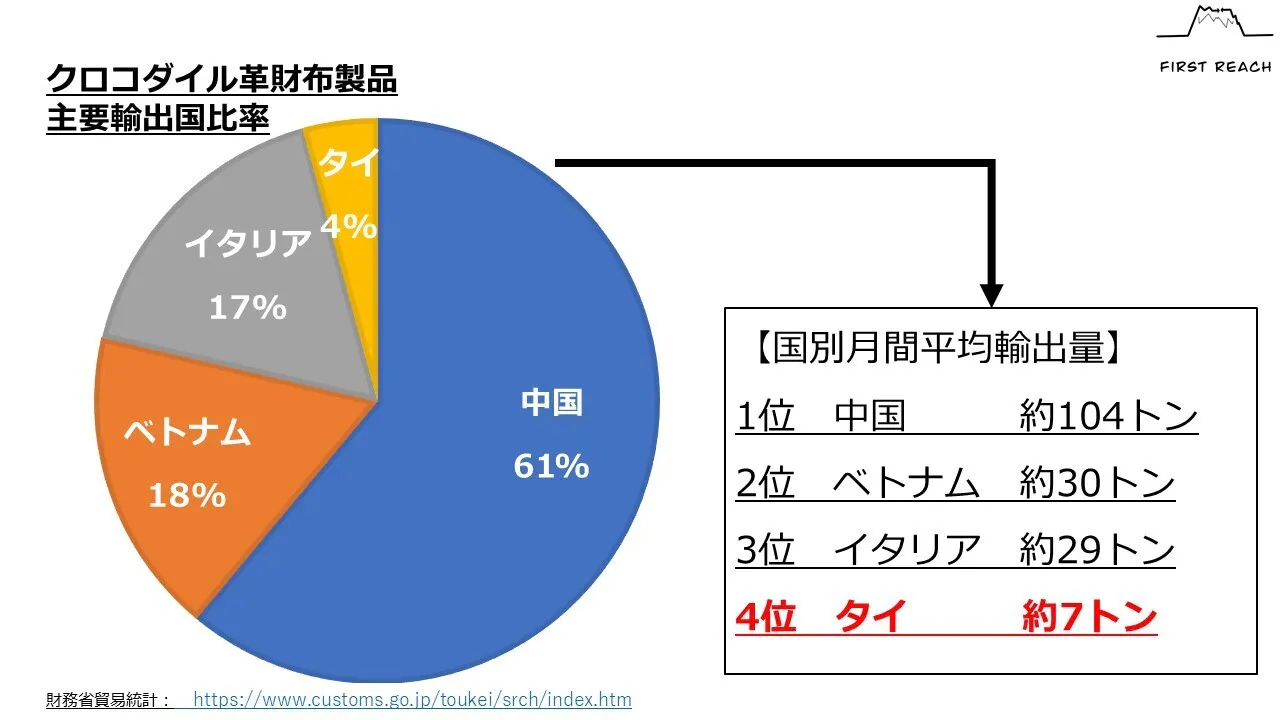 2019年度、日本に輸入されたクロコダイルの財布(※HSコード; 4202.31-200)のメジャー輸出国の数量を見てみると、中国(約104トン/月)、ベトナム(約30トン/月)、イタリア(約29トン/月)と比較してタイ(約7トン/月)は他国のクロコダイル革財布の輸出量よりも圧倒的に少ないことが分かります。