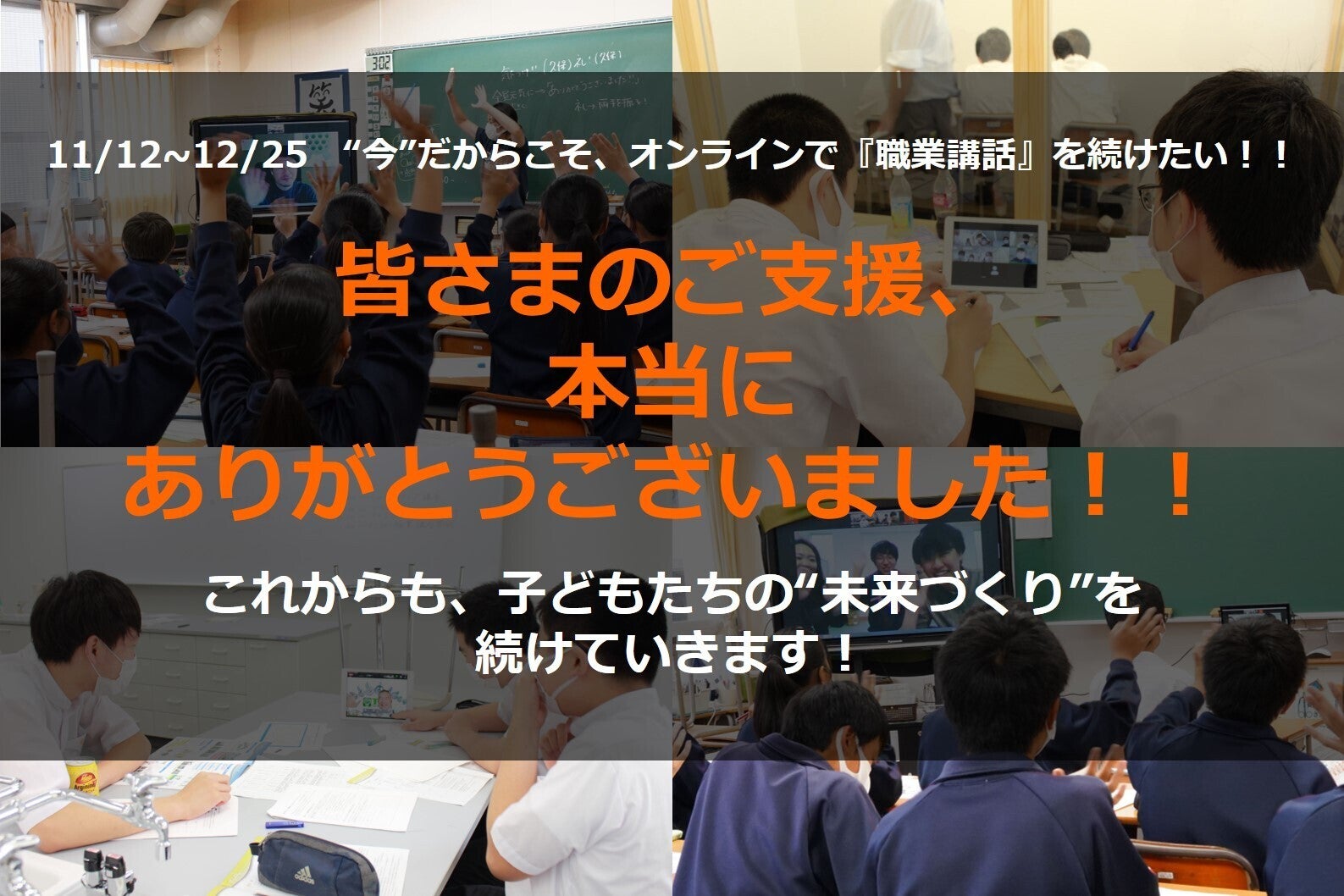 これまでほぼボランティアで行ってきた教育現場でのキャリア教育支援に、これだけたくさんの皆様のご支援をいただくことができたという事実は、今後活動を推進していくうえでも大きな前進であり、未来への希望をいただいたように感じています。