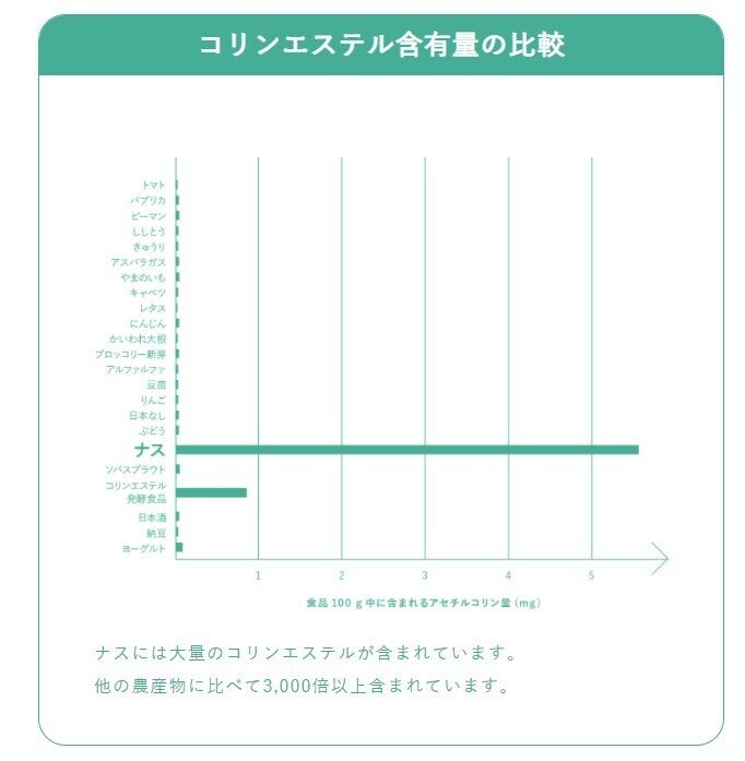 ナスに豊富に入っているリラックス成分です。コリンエステルは、胃や腸に作用し、自律神経のバランスを調節してリラックス作用をもたらします。ナス由来の成分ですし、体に吸収されないので、とても安全な成分です。そのリラックス作用により、高めの血圧、落ち込みがちな気分、睡眠状態の改善作用を示すことが研究で分かっています。