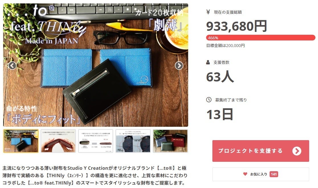 プロジェクトが目標金額の466%を達成する事ができました!ご支援を頂きました皆さまには感謝申し上げます。今回、コラボしました「THINly」は、大手出版社の通信販売で5年以上全アイテムの中で1位を取るという実績を持った財布です。コラボが実現し、Studio Y Creationならではの素材の良さとカラー、そして仕立ての良さをブラッシュアップした製品になっております。プロジェクトも残り13日までとなりました。リターン価格はこのプロジェクトだけです。ご支援をご検討中の方は、この機会をお見逃しないようご支援をお待ちしております。https://camp-fire.jp/projects/view/333999また、渋谷PARCO1FのBOOSTER STUDDIOにて展示もしております。お近くにお越しの際は、ご無理の無い範囲でご覧頂ければと思います。