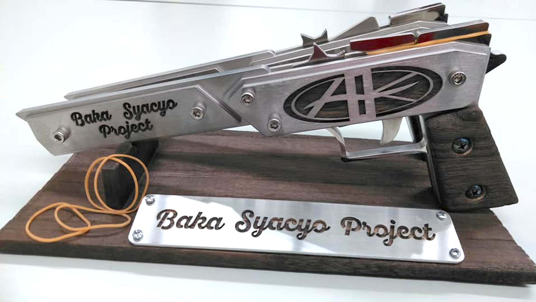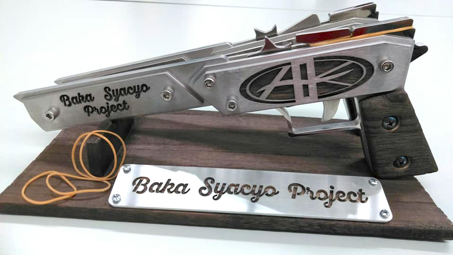 過去に『バカ社長シリーズ』として作った輪ゴム銃が、ある機械メーカーのコンテストで賞を取りました!