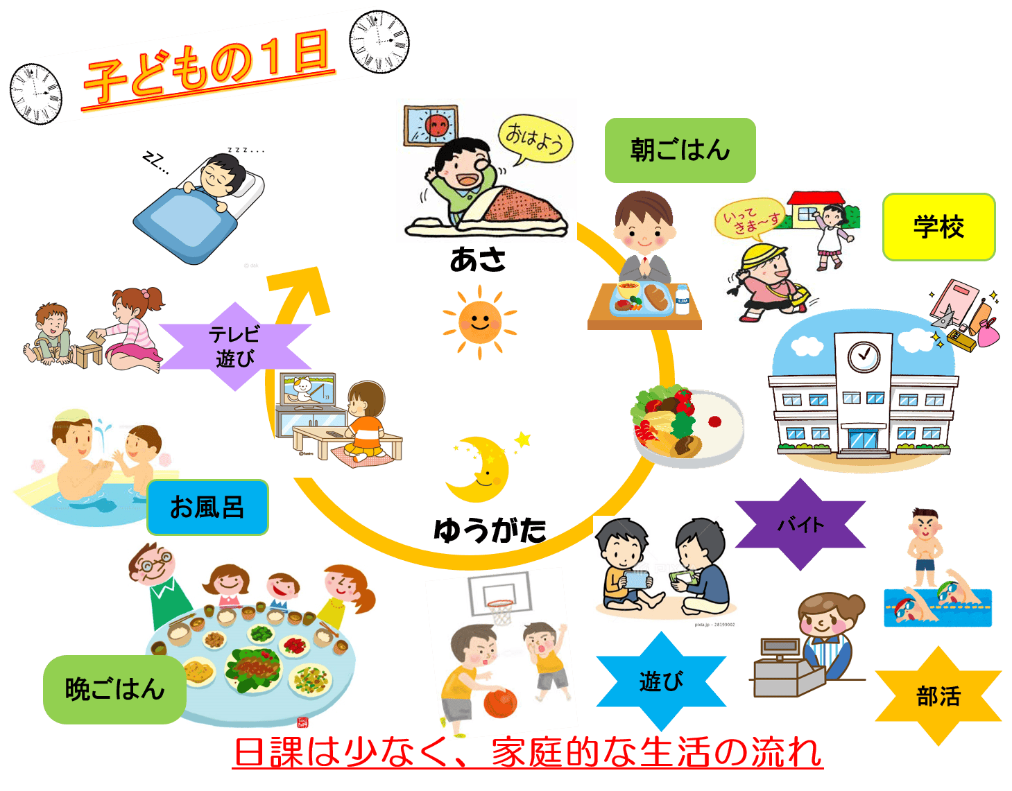 この繰り返しでありますが、毎日みんなで生活を送っていると、あっという間に1日が過ぎていきます! そして、『学校行く準備できたー?』『宿題おわったー?』『お菓子たべるー!』『もう晩ご飯やでー!』毎日いろいろな声が聞こえてきます。
