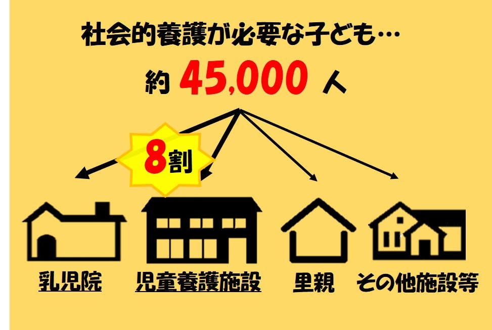 日本では、約45,000人の子ども達が、社会的養護の対象となり、約8割の子どもが児童養護施設や乳児院などの施設で暮らしています。