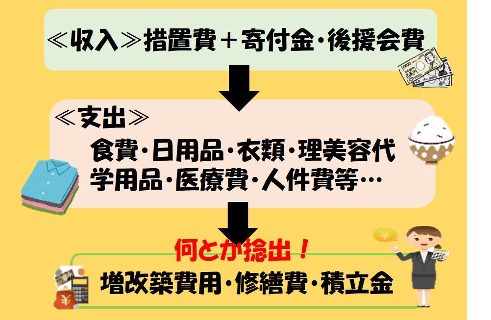施設の運営資金は『措置費』という国や県からのお金によってまかなわれています。国や県からのお金によってまかなわれています。