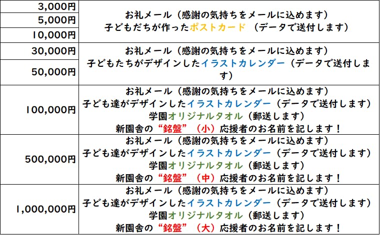 チラシのリターンにつきまして、一部内容を変更しております。上記リターンにて学園より感謝のお気持ちを添えお礼をさせていただきます。ご了承ください。