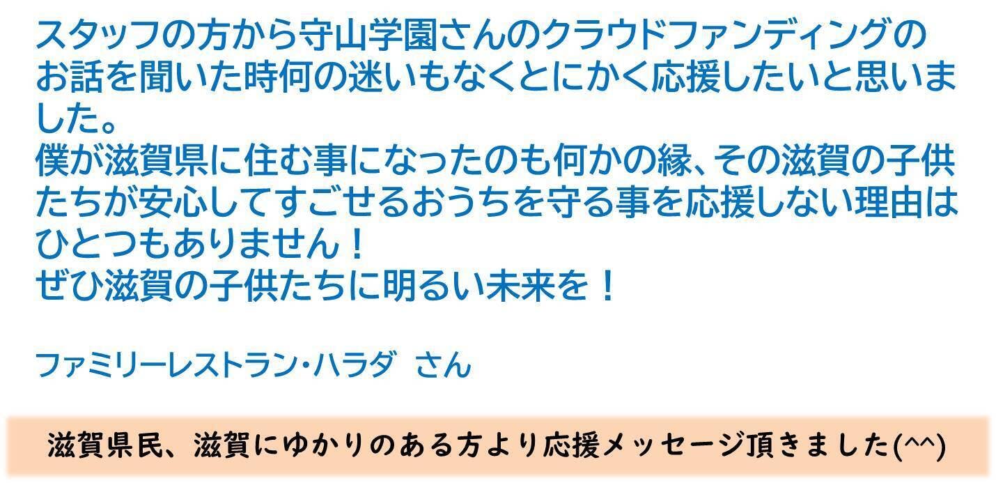 2021/02/04 17:17この度は、クラウドファンディング『守山学園改築プロジェクト』に多数の方々のご支援、ご協力をいただきまして、ありがとうございました。新型コロナウイルスの影響で大変な中、多額のご支援をいただけたことは本当にありがたく、職員、子ども一同、深く感謝しております。サイトを通じてのご支援 596人 8,276,846円ご持参やお振込みでのご支援 311人 9,213,458円総額 17,490,304円のご支援が集まりました。※領収書の発送は、準備でき次第、発送させていただきます。※返礼品については、2021年3月のお届けを目指して準備しております。 準備の状況、発送のお知らせなど、随時お知らせします。もうしばらくお待ちください。ご支援いただいた方をご紹介させていただきます。(順不同・敬称略) ※2/3時点・サイトを通じてご支援いただいた方(ユーザー名) 583人(のべ596人)014sfmk/021satomi/041b979034a4/043/0621megu/0622chao/07101676/10Kitajuuji5Tragl/119580yen/12345adg/19760523yabutetsu/1f183dd16164/2526takagi/2539/2598359f2624/2cea96093bf4/31odan/3517eea5b4a4/3678232438930345/3a3da3eb0334/427t/4645a46d3944/5220044/6e9126684084/6ef3ddf84434/78870d1396c4/7me50/8739junko/8fda775bff04/911d0225b5f4/9a4c909b20e4/a37398t/Aaaaaaaami/aiko0106/akiimuushizu/akiko9711/Akira Goma/alohi/among34/angienaoko/Aokiharu/aokita/aokiyou0829/arimi0511/aruvireoaya/asegawa/asinagapanya/asprNonnchann/ASUKAHKK/atchan16/Athushi Takuma/atm09msa/atmyfji/ATSUKOCHI/Atsumi1217/ayako_88/ayanayuga/ayano16/ayumij5/azinomotoko/azuazu8932/azumi17/a_chaton/ballantine324/battitude/bc4705b791c4/bellflower824/bigfransbaby/bintang55/biribirimaru/bitter358/biwacowboys/Biwahan/biwakohan/BobbyJudy/boma14/bon175165/brahms28/buttobiazumasa22/camonasu/Cappuccino_cap_cap/catbacon/cats5cafe/chalaboco/Chappi1279/chibimeri/chie_tkrzk/chihaya t/Chikamune AH/chim09lives/chips08/chiyo_winter/chocolat5518/Choco_to_Kani/christiane173/Chumuta/chunchunko/churauta610/cocoa100/Codeblue/concent2002/connie17067/coral_reef/corefighter0223/coro1995/d91e0dbba194/daicom/daidaiN430/daikokutax/doradorabanban/dtr0220/e4be87b318b4/ef4a10896464/eihi/ekowakosan/ELECTRICDADDY/Emi Ogawara/eudunda/exorcist/ezdave/fjh/FK1217/floatjelly7731/fufufu39/fukunk/fumiakih/funasaku/funasan2784/f_oka/g han/GatNeg421/GENETO/gh640/godfather3/godoshiki/golakes nohohon/gooyan55/gr0031vv/gu1046/guest00633bb290/guest053ace2b7134/guest08b40c7519e4/guest0bfd5706a224/guest152927683ee4/guest15512e0ce804/guest185c1e449f24/guest18c1ebfa7034/guest1afbdba29444/guest219a0c904ac4/guest2b1e58eca184/guest3129b5f903c4/guest33abd1c5e744/guest3635f084f064/guest37b394bdb4/guest3e8683a0e7/guest4dc4e03042f4/guest52dd9f7b4c/guest58260dd82b/guest59e94e7c7974/guest781062780b84/guest7e64df3876/guest80fbb0035a/guest877fdbdeb454/guest8b2753fbbc/guest8d5928fb6f44/guest92afaeff8b44/guest99d5a25214/guesta35f31126384/guesta3fad872b504/guesta8ed3f69a314/guestb1cf7ec3bb64/guestb6123c880704/guestb91fdf08d914/guestbb8379498de4/guestbf59185da524/guestc0fbe382d2b4/guestc18fea387704/guestc22886557f04/guestc5dc32ff5c44/guestc9d3a09201/guestcec6aa714604/guestd0e98cabfa24/gueste5016feaaed4/guestf7a9a8251a04/guestf81664866ea4/guestfb136b151304/guestfb4e8ab43d04/gusan_gusan/gutyan/hagumiki0702/halbone/Hamburg0222/hana 226128/hanaeshiota/happysad6464/Harue Tomioka/HARUKA1220/harum1010/Hatti0629/Hello86/HelloNancy/hi3yamamoto/hidamari1078/hideoku99ca/hikaru100016103016/himawariobasan/hinaarare/Hiraki Ai/Hiroki Miura_Mark2/Hiromi_heartful/hironaoto/Hiroshi93/Hiroshi_Murata/Hitmaru/hiyamamakoto/hkawano1981/hkozawa/hn5410163/hotaru3954/hrtn94/htmikrs1103/hty_m/hykun/hyogo_d/idumi0331/iguanasuke/iidatomoko/iketama/ikunobu193yui/ImotoChihiro/inoguchi fuduki/inu38/ioo/irinyan/ironcastle_Dan/ishiken2000jp/iwane harumi/Izukiyo/Jay Shimmy/jcfisher/jennjiro/JERRYBEANS/JessGordon/jimahaha/Juewa/jun_b_chopper/jyujiro/kadono misako/kaerusan4784/kaguya_daiki_take/kahochi/kakizoe kaoru/kamimurata/kanabun330/kanae0101/kanamana312/kanasake/kanassy/kanekame20/kaotaka/karisumasio/Kayo Iba/kazekirameku/kblessing1/kc31/keiichi sakoda/kenchiyo/kencyako/Kenichi Shingai/keniso/kenny_1952/keyama/khpurittsu871/KIMIKO1024/kinakomimi/kinako__san/klike87/kobobakabon/Kobumaki1434/kohituji2021/kokiho/kokura80/konepan/kotaniyui/kotorahamilton/kouei_arahori/kouenjishorin/kpaya815/kumi61/KumikoUeyama/KuRaTaERi/kuriyat/kurohito/kuro_akko/kwmt921/kylebarrow/kyochan_san/kyoko31/kyokosala/k_kamei/lakeslove/Leognan1/locolococolor/loghouse/lovelilimusic/M atsu 128/m25p02/MachaGUMI/machupita/maekawa taiichi/Maito N/maki8oo/makinaka/makomichi2000/mamedeppo/mamoru1950/mandabop/manzarademo/margo/mari0930/marimo marimo/marizou67/marokedo/marudy55/masaco6002/masahiro0420/Masaki Washita/masako kawasaki/mas_cor457/matsuohonoka/matty_pig/Mayomayomimimi/Mayumi0308/MD2013/megu523/megukomocchi/megumeguun/Meimiyu/mflower01/mgrsto/mh1653/MIE MAKIFUJI/MIHARU KATAOKA/miho1219/Mikiskiyhm/mitsue kosugi/Mitsuhashi0721/mitsuhito0422/mitsuka0731/miyu25311/miyumon/mizuuminokuni2021/mk_ron/mm21ryo/moirtakuma/momo0801/momomon_wawawan/mongoika/morimori19860323/Msosiru/mu2525/muon_0422/mura_t/MuseTMK/MutsumiSuda/mutukiyuna/m_oki868/nacoa_smltoger/nairobi_marines/najin916/naka8444/nakagiriphoto/nakamura1297/naki72/namazu88/NANAIRO_MVS/nanass/nanayumi/naodorajp/Naoki Isogawa/naokomarcy/naos99/Narita Asami/natsusig/neitoneito/nekoyamanekota/nenjoan1102/nheidt/nijiiro_michico/nishioka5010/nissamarts/nk5622/nnazyougryou9/nnkwhrm/no9endo/Nobuhiko Ohtani/Nobuko M/noguchi123/NOMURA_ROUMU/non218/NONOMURA SHINJI/Noriko701017/norituba/Nozomi10181002/nyacchi703/n_ayaka2525/ogawa777/ohiru5112310/okinobori/okitahiroyuki/okotata/olivedoll/on1000/Onso9ponta/oogis/oonoyuuta/OP2020/oseisuu/ozwchi/p uman/panthergogo/parcy77/Parka248/Patman73/pekokoe/pekowatanabe/pianomomo/pivirginis/ppp_mjs/pukU_taro/Qchan/QvxDq8o1bmgAATVO/ragez/rai