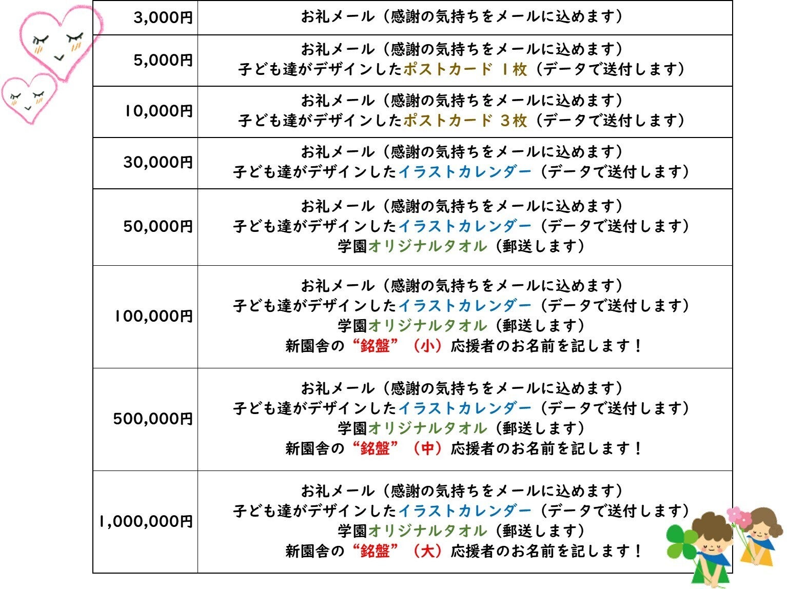 この度は、クラウドファンディング『守山学園改築プロジェクト』に多数の方々のご支援、ご協力をいただきまして、ありがとうございました。新型コロナウイルスの影響で大変な中、多額のご支援をいただけたことは本当にありがたく、職員、子ども一同、深く感謝しております。サイトを通じてのご支援 596人 8,276,846円ご持参やお振込みでのご支援 311人 9,213,458円総額 17,490,304円のご支援が集まりました。※領収書の発送は、準備でき次第、発送させていただきます。※返礼品については、2021年3月のお届けを目指して準備しております。 準備の状況、発送のお知らせなど、随時お知らせします。もうしばらくお待ちください。ご支援いただいた方をご紹介させていただきます。(順不同・敬称略) ※2/3時点・サイトを通じてご支援いただいた方(ユーザー名) 583人(のべ596人)014sfmk/021satomi/041b979034a4/043/0621megu/0622chao/07101676/10Kitajuuji5Tragl/119580yen/12345adg/19760523yabutetsu/1f183dd16164/2526takagi/2539/2598359f2624/2cea96093bf4/31odan/3517eea5b4a4/3678232438930345/3a3da3eb0334/427t/4645a46d3944/5220044/6e9126684084/6ef3ddf84434/78870d1396c4/7me50/8739junko/8fda775bff04/911d0225b5f4/9a4c909b20e4/a37398t/Aaaaaaaami/aiko0106/akiimuushizu/akiko9711/Akira Goma/alohi/among34/angienaoko/Aokiharu/aokita/aokiyou0829/arimi0511/aruvireoaya/asegawa/asinagapanya/asprNonnchann/ASUKAHKK/atchan16/Athushi Takuma/atm09msa/atmyfji/ATSUKOCHI/Atsumi1217/ayako_88/ayanayuga/ayano16/ayumij5/azinomotoko/azuazu8932/azumi17/a_chaton/ballantine324/battitude/bc4705b791c4/bellflower824/bigfransbaby/bintang55/biribirimaru/bitter358/biwacowboys/Biwahan/biwakohan/BobbyJudy/boma14/bon175165/brahms28/buttobiazumasa22/camonasu/Cappuccino_cap_cap/catbacon/cats5cafe/chalaboco/Chappi1279/chibimeri/chie_tkrzk/chihaya t/Chikamune AH/chim09lives/chips08/chiyo_winter/chocolat5518/Choco_to_Kani/christiane173/Chumuta/chunchunko/churauta610/cocoa100/Codeblue/concent2002/connie17067/coral_reef/corefighter0223/coro1995/d91e0dbba194/daicom/daidaiN430/daikokutax/doradorabanban/dtr0220/e4be87b318b4/ef4a10896464/eihi/ekowakosan/ELECTRICDADDY/Emi Ogawara/eudunda/exorcist/ezdave/fjh/FK1217/floatjelly7731/fufufu39/fukunk/fumiakih/funasaku/funasan2784/f_oka/g han/GatNeg421/GENETO/gh640/godfather3/godoshiki/golakes nohohon/gooyan55/gr0031vv/gu1046/guest00633bb290/guest053ace2b7134/guest08b40c7519e4/guest0bfd5706a224/guest152927683ee4/guest15512e0ce804/guest185c1e449f24/guest18c1ebfa7034/guest1afbdba29444/guest219a0c904ac4/guest2b1e58eca184/guest3129b5f903c4/guest33abd1c5e744/guest3635f084f064/guest37b394bdb4/guest3e8683a0e7/guest4dc4e03042f4/guest52dd9f7b4c/guest58260dd82b/guest59e94e7c7974/guest781062780b84/guest7e64df3876/guest80fbb0035a/guest877fdbdeb454/guest8b2753fbbc/guest8d5928fb6f44/guest92afaeff8b44/guest99d5a25214/guesta35f31126384/guesta3fad872b504/guesta8ed3f69a314/guestb1cf7ec3bb64/guestb6123c880704/guestb91fdf08d914/guestbb8379498de4/guestbf59185da524/guestc0fbe382d2b4/guestc18fea387704/guestc22886557f04/guestc5dc32ff5c44/guestc9d3a09201/guestcec6aa714604/guestd0e98cabfa24/gueste5016feaaed4/guestf7a9a8251a04/guestf81664866ea4/guestfb136b151304/guestfb4e8ab43d04/gusan_gusan/gutyan/hagumiki0702/halbone/Hamburg0222/hana 226128/hanaeshiota/happysad6464/Harue Tomioka/HARUKA1220/harum1010/Hatti0629/Hello86/HelloNancy/hi3yamamoto/hidamari1078/hideoku99ca/hikaru100016103016/himawariobasan/hinaarare/Hiraki Ai/Hiroki Miura_Mark2/Hiromi_heartful/hironaoto/Hiroshi93/Hiroshi_Murata/Hitmaru/hiyamamakoto/hkawano1981/hkozawa/hn5410163/hotaru3954/hrtn94/htmikrs1103/hty_m/hykun/hyogo_d/idumi0331/iguanasuke/iidatomoko/iketama/ikunobu193yui/ImotoChihiro/inoguchi fuduki/inu38/ioo/irinyan/ironcastle_Dan/ishiken2000jp/iwane harumi/Izukiyo/Jay Shimmy/jcfisher/jennjiro/JERRYBEANS/JessGordon/jimahaha/Juewa/jun_b_chopper/jyujiro/kadono misako/kaerusan4784/kaguya_daiki_take/kahochi/kakizoe kaoru/kamimurata/kanabun330/kanae0101/kanamana312/kanasake/kanassy/kanekame20/kaotaka/karisumasio/Kayo Iba/kazekirameku/kblessing1/kc31/keiichi sakoda/kenchiyo/kencyako/Kenichi Shingai/keniso/kenny_1952/keyama/khpurittsu871/KIMIKO1024/kinakomimi/kinako__san/klike87/kobobakabon/Kobumaki1434/kohituji2021/kokiho/kokura80/konepan/kotaniyui/kotorahamilton/kouei_arahori/kouenjishorin/kpaya815/kumi61/KumikoUeyama/KuRaTaERi/kuriyat/kurohito/kuro_akko/kwmt921/kylebarrow/kyochan_san/kyoko31/kyokosala/k_kamei/lakeslove/Leognan1/locolococolor/loghouse/lovelilimusic/M atsu 128/m25p02/MachaGUMI/machupita/maekawa taiichi/Maito N/maki8oo/makinaka/makomichi2000/mamedeppo/mamoru1950/mandabop/manzarademo/margo/mari0930/marimo marimo/marizou67/marokedo/marudy55/masaco6002/masahiro0420/Masaki Washita/masako kawasaki/mas_cor457/matsuohonoka/matty_pig/Mayomayomimimi/Mayumi0308/MD2013/megu523/megukomocchi/megumeguun/Meimiyu/mflower01/mgrsto/mh1653/MIE MAKIFUJI/MIHARU KATAOKA/miho1219/Mikiskiyhm/mitsue kosugi/Mitsuhashi0721/mitsuhito0422/mitsuka0731/miyu25311/miyumon/mizuuminokuni2021/mk_ron/mm21ryo/moirtakuma/momo0801/momomon_wawawan/mongoika/morimori19860323/Msosiru/mu2525/muon_0422/mura_t/MuseTMK/MutsumiSuda/mutukiyuna/m_oki868/nacoa_smltoger/nairobi_marines/najin916/naka8444/nakagiriphoto/nakamura1297/naki72/namazu88/NANAIRO_MVS/nanass/nanayumi/naodorajp/Naoki Isogawa/naokomarcy/naos99/Narita Asami/natsusig/neitoneito/nekoyamanekota/nenjoan1102/nheidt/nijiiro_michico/nishioka5010/nissamarts/nk5622/nnazyougryou9/nnkwhrm/no9endo/Nobuhiko Ohtani/Nobuko M/noguchi123/NOMURA_ROUMU/non218/NONOMURA SHINJI/Noriko701017/norituba/Nozomi10181002/nyacchi703/n_ayaka2525/ogawa777/ohiru5112310/okinobori/okitahiroyuki/okotata/olivedoll/on1000/Onso9ponta/oogis/oonoyuuta/OP2020/oseisuu/ozwchi/p uman/panthergogo/parcy77/Parka248/Patman73/pekokoe/pekowatanabe/pianomomo/pivirginis/ppp_mjs/pukU_taro/Qchan/QvxDq8o1bmgAATVO/ragez/raizo2020/ramiatail