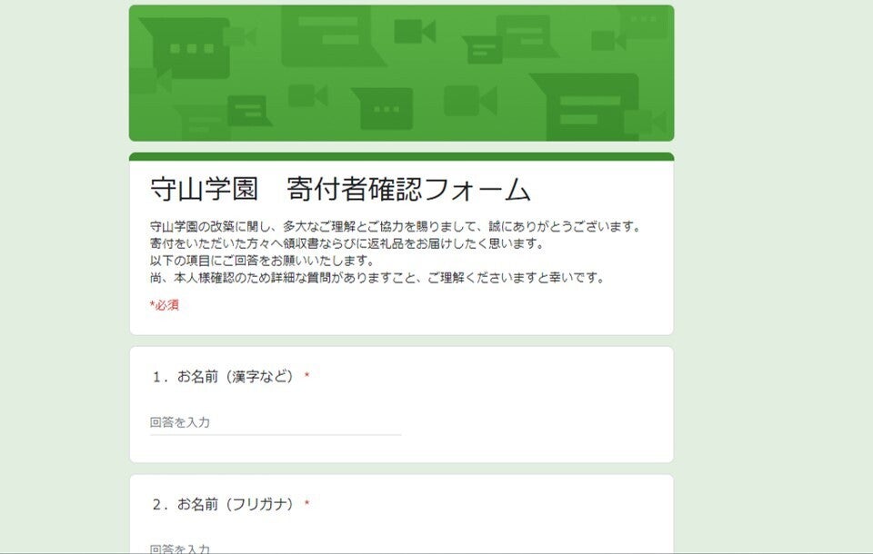 ゆうちょ、銀行、持参などで寄付をくださった方々へ。(このサイト内の手続き以外の方法でご支援くださった方へのお知らせです。)『領収書、ならびに返礼品』を郵送したく思います。メールアドレスや、ご住所が必要となりますので、以下のフォーム入力にご協力を宜しくお願いします。https://forms.gle/usqro4zXJruKFtuu6 税制優遇対象となります。知人の方にもお伝え頂けると嬉しいです。なお、事務処理の関係上、2月末を締め切りとさせて頂きます。御用の方は、以下へお問い合わせください。 TEL:077-582-2887(平日9~18時) FAX:077-582-7966 又は守山学園ホームページ内のお問い合わせフォームへお電話の場合、平日9~18時ですと、担当者が対応させていただきます。どうぞ、宜しくお願いいいたします。