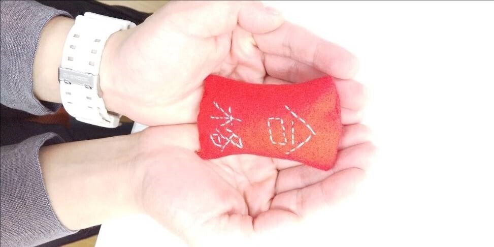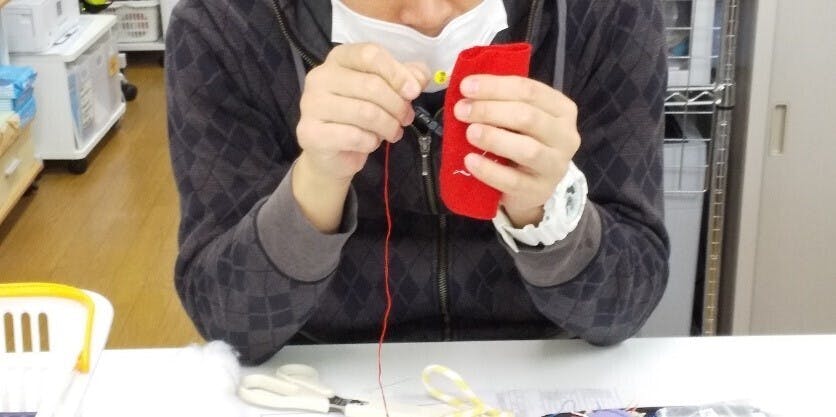 裁縫が苦手な男性職員。今年受験の子にお手製のお守り作り。