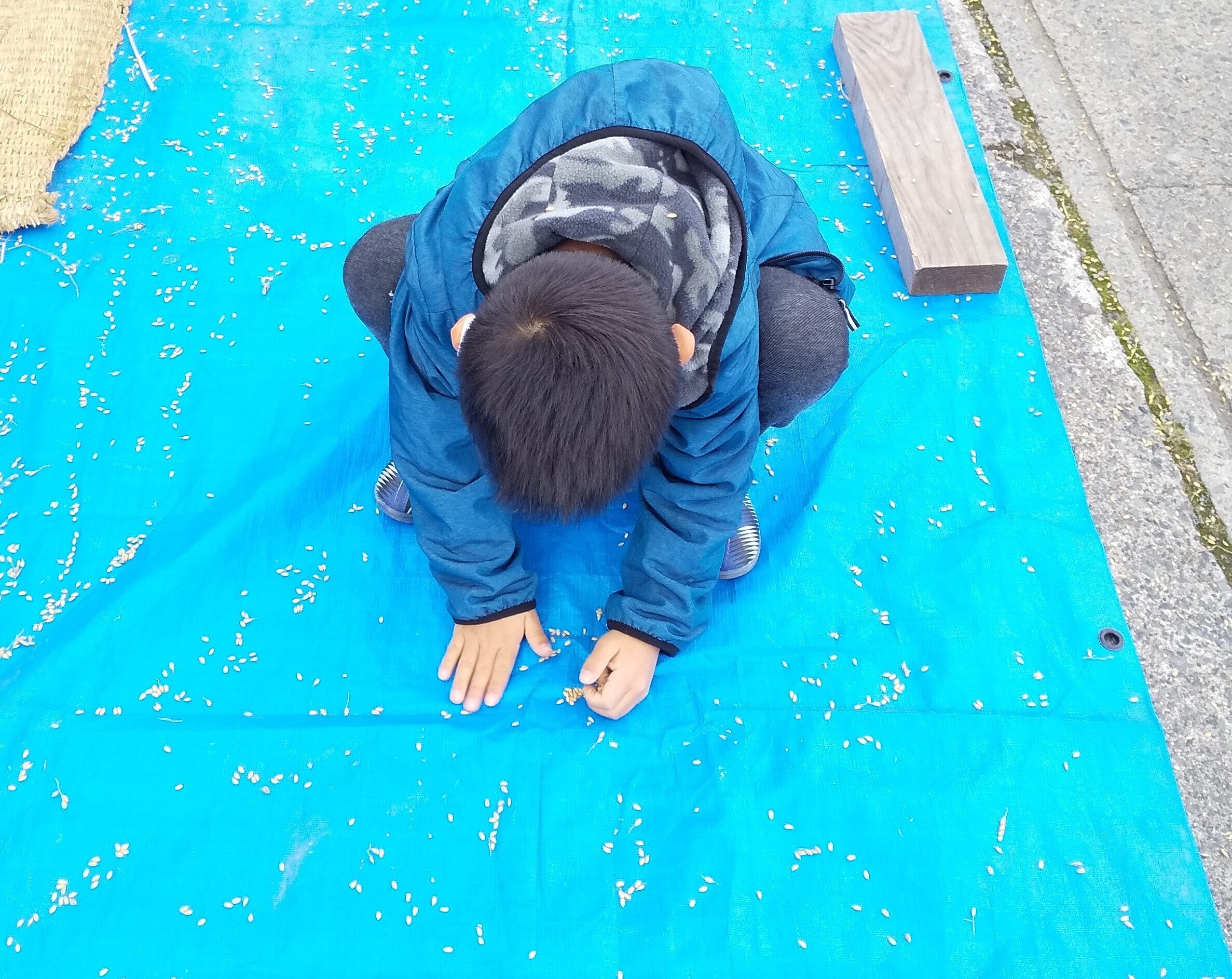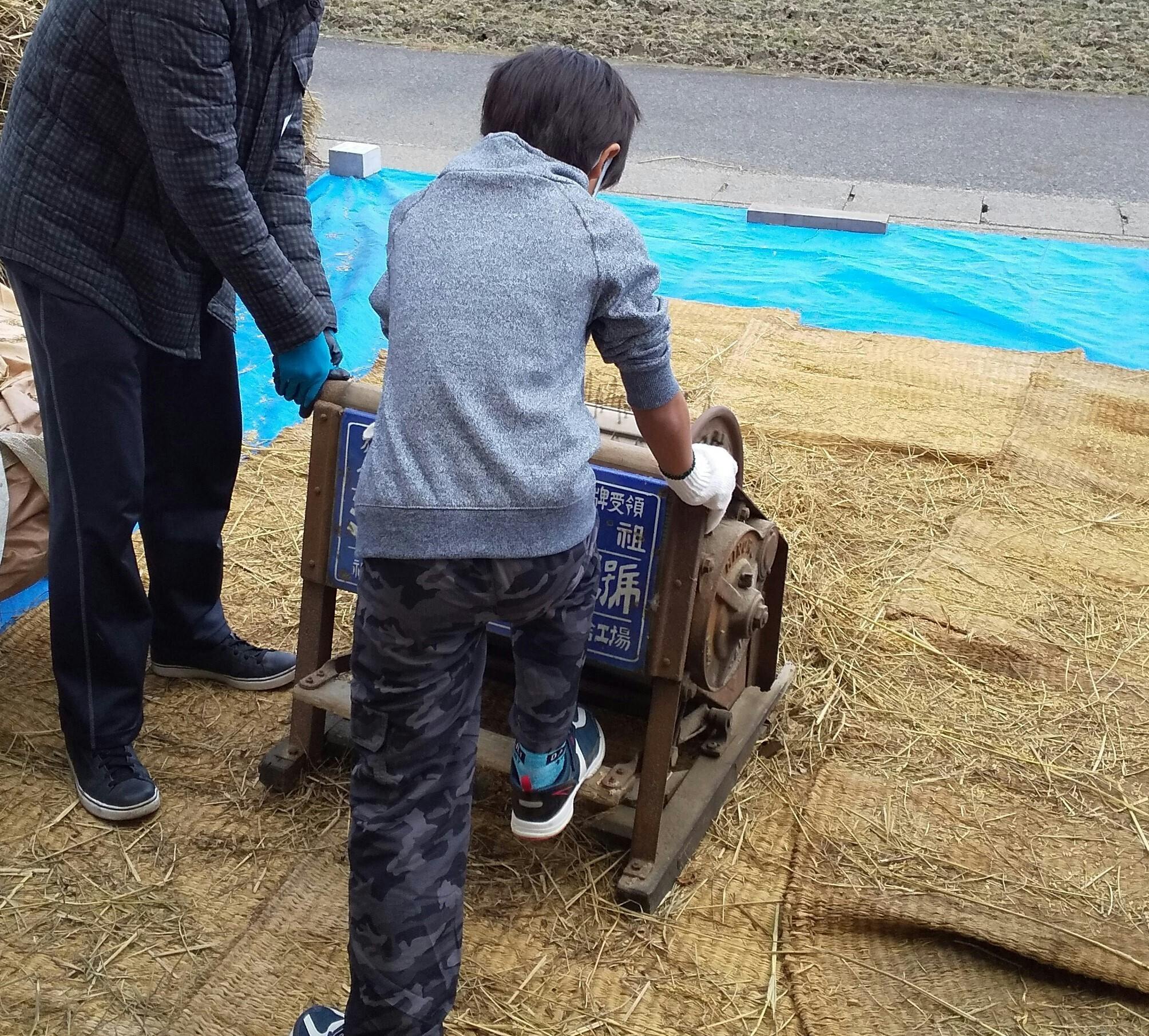 足踏み脱穀機での貴重な体験を板倉ファームにて!「昔の人大変やな」「お米一粒残らず拾うわ」の声が。