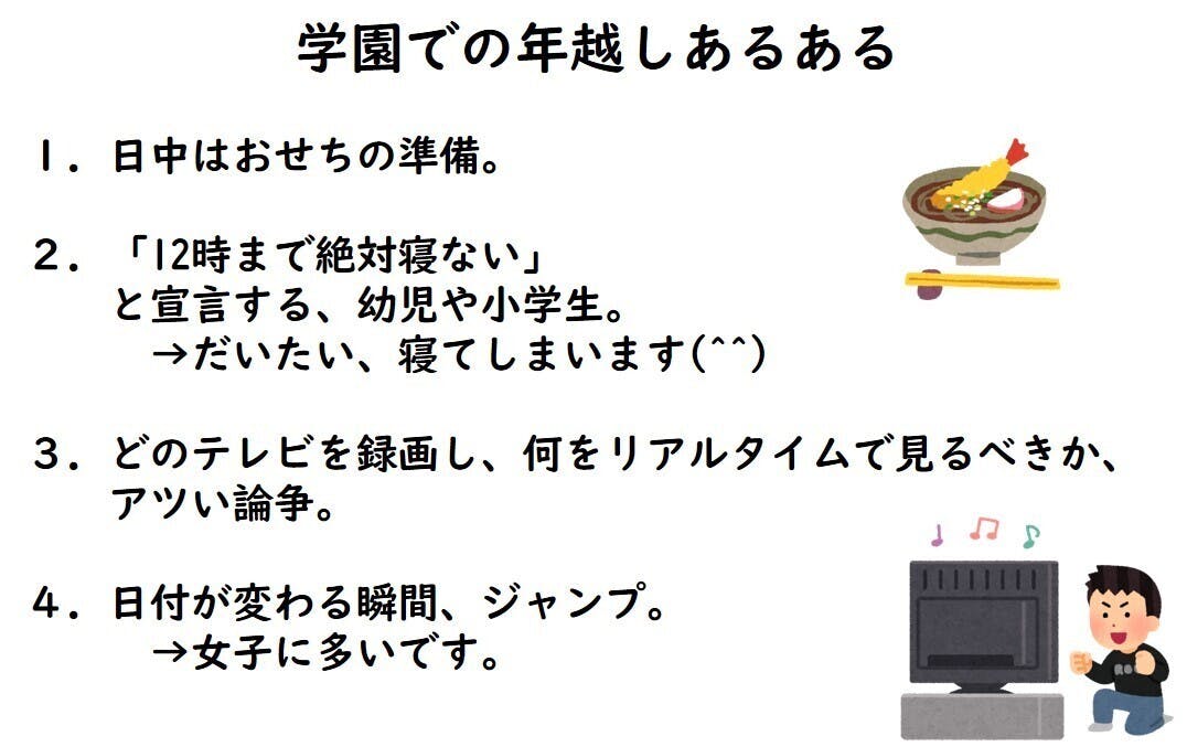 …などなど。家庭で過ごす子ども達と、違うようで、違わないところも多いのではないでしょうか。今年はどんな大晦日になるのかな。気持ちよく、元気に、新年を迎えられますように。