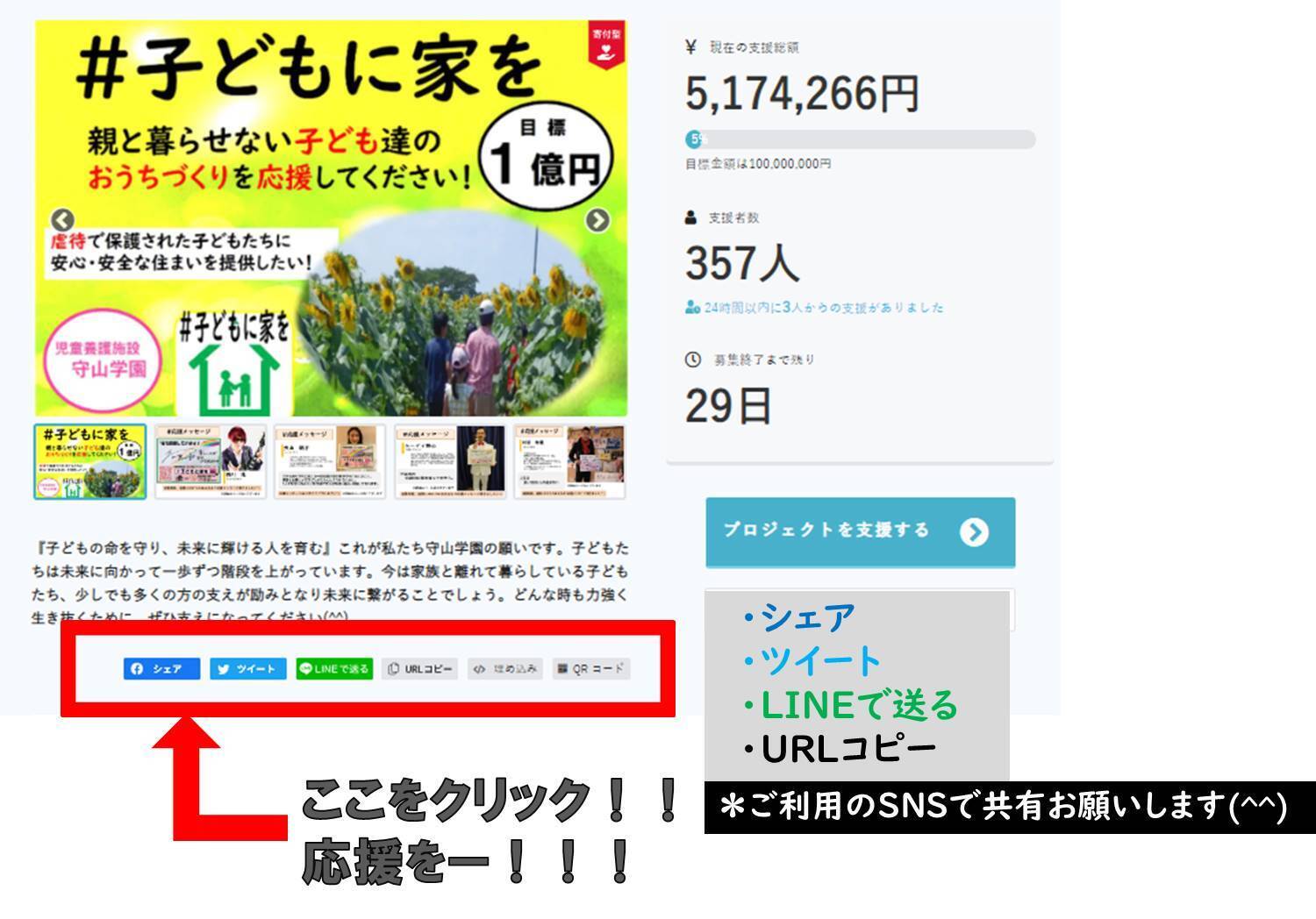 『シェア、ツイート、LINEで送る、URLコピー』の中からご利用されているものをクリックし、子どもたちへのメッセージ、応援コメントをお願いします!