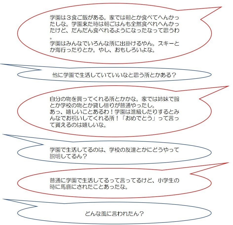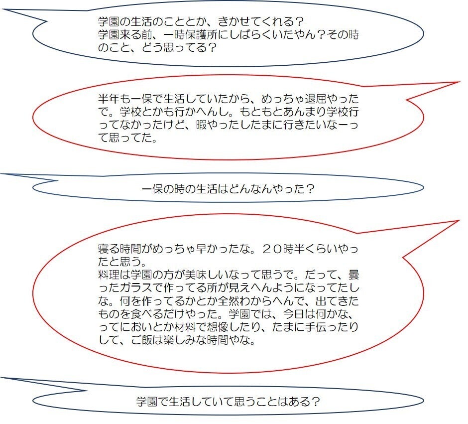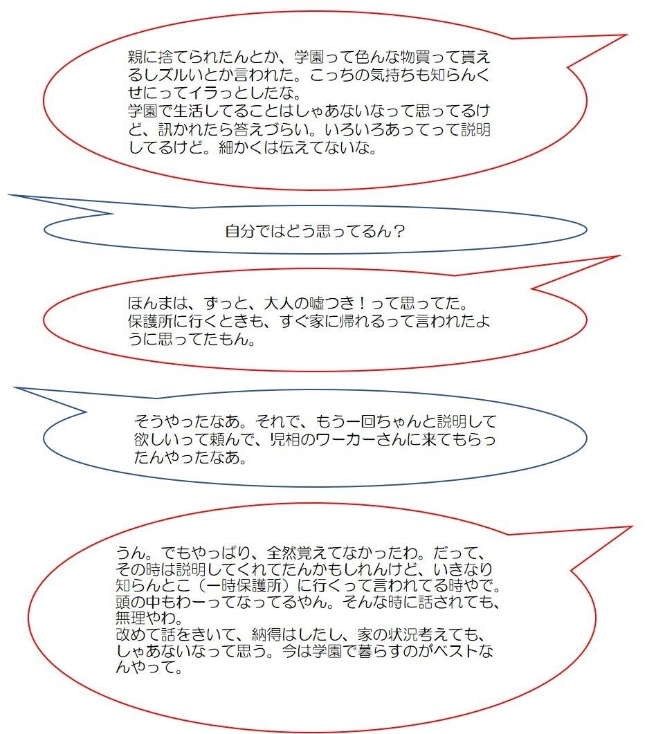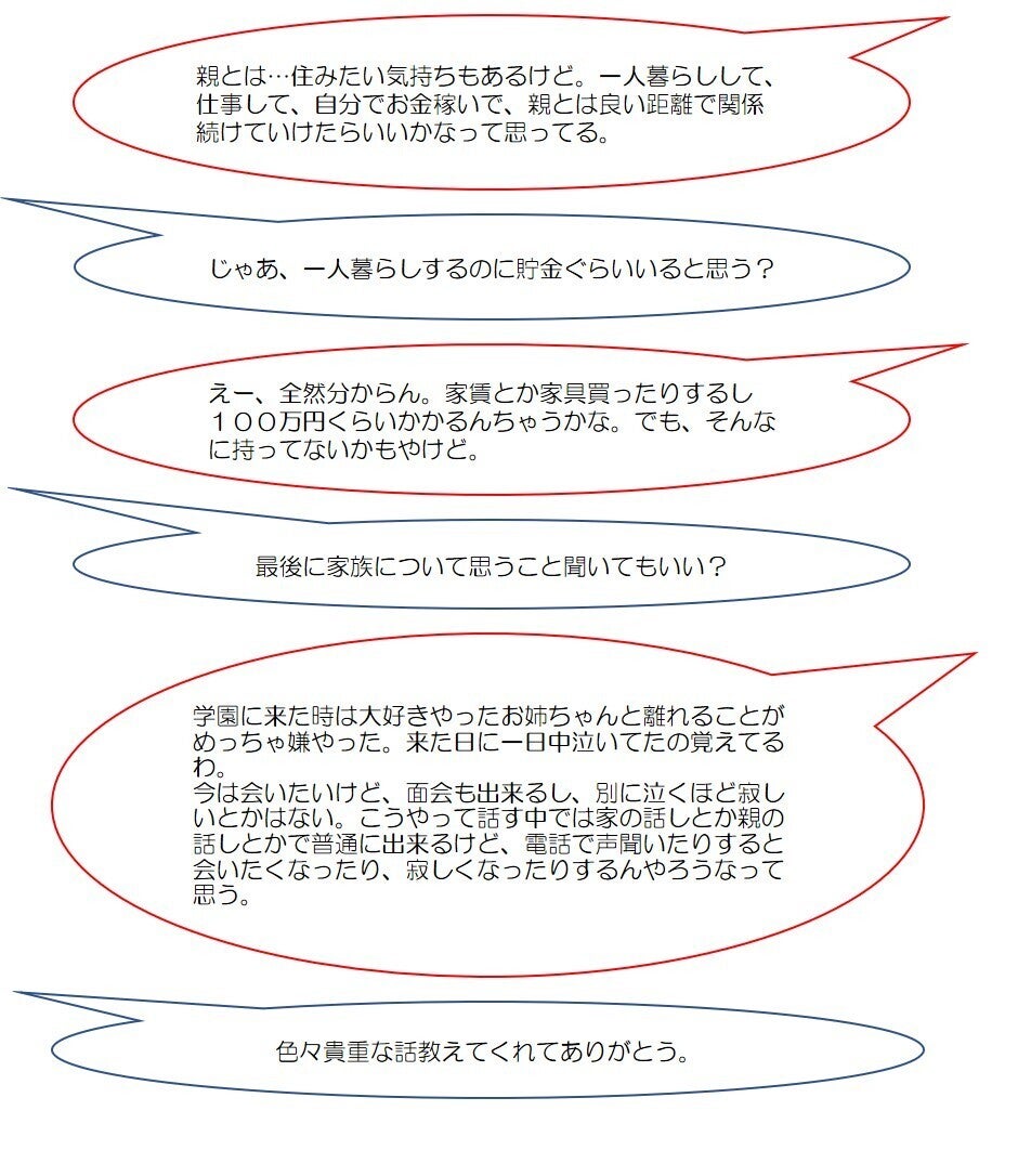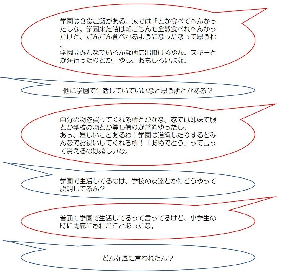 一時保護所にいた時のこと、学園での生活、家族のこと、将来のことなどなど…