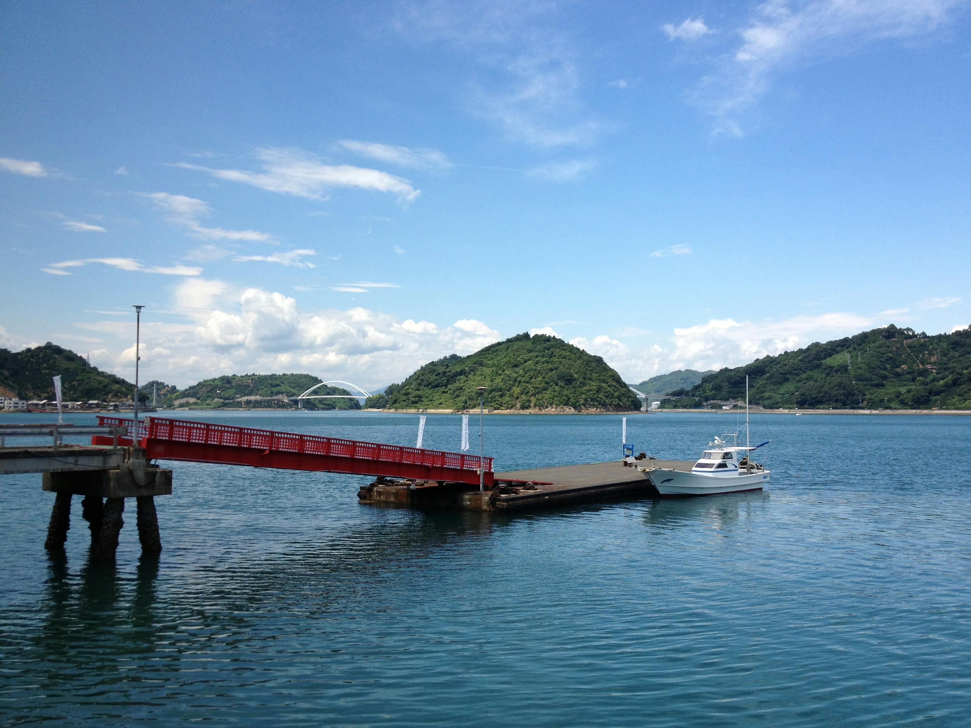 潮の干満の激しい瀬戸内海ではこの御手洗桟橋も満潮時は潮位が上がることにより平らになり、干潮時は坂道となります。