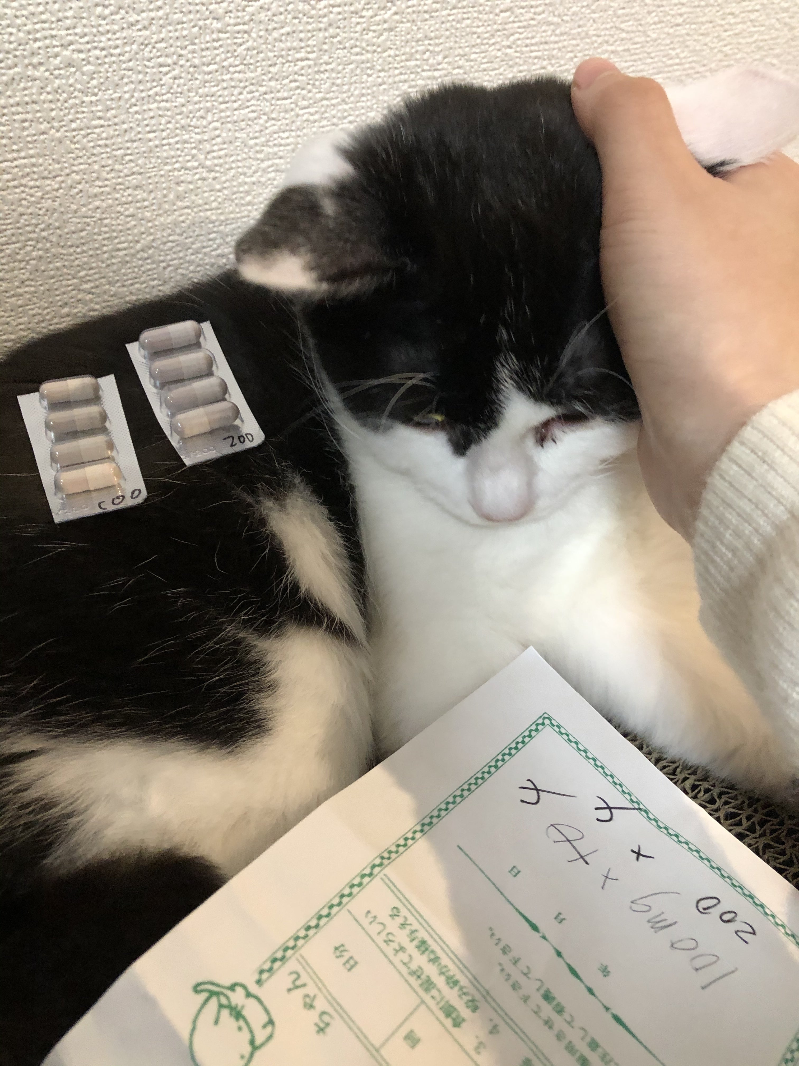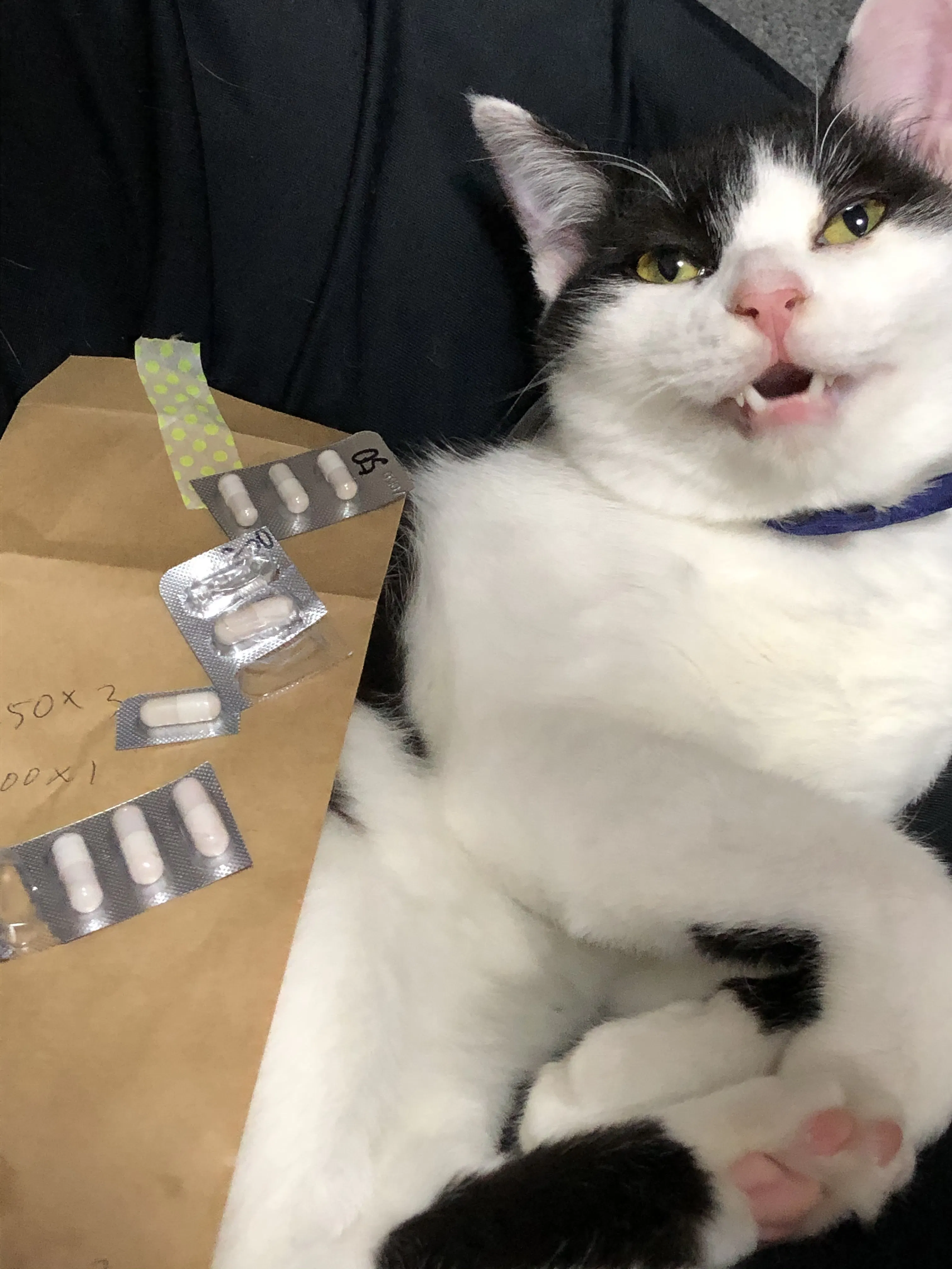 その後、保護猫カフェの代表の方とその後の様子などの連絡をしていたのですが、様子を見たいとのことで連れて行った時です。ムティアンという薬の存在を知りました。海外製のもので、たいへん高価な薬ですが治療ができるものでした。その後は病院で血液検査などを行い、医者の方からほぼFIPであると診断をいただいた上で、保護猫カフェの代表の方の経由でムティアンで病気の治療に専念しております。