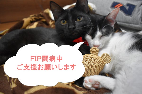 現在9月下旬から始めた投薬が1ヶ月近く経とうとしています。FIPかもしれないと診断されたとき、ウェットフードもドライフードも食べない、体がえらくて遊ぶこともできずにいた子が今はとても元気で、兄弟の黒猫りんちゃんと遊んでいます。体調によっては誤差はありますが、約80日程で完全完治ができるとことなのでこのまま投薬を続けていきたいです。