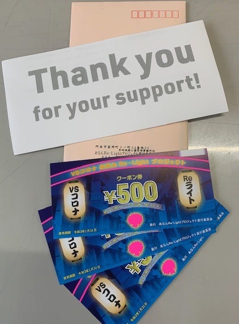 御礼のお手紙とプロジェクト登録店舗で使える期間限定チケットをお送りさせて頂きます。5,000円コースの場合5,500円分、10,000円コースの場合、12,000円のチケットをお送りさせていただきます。
