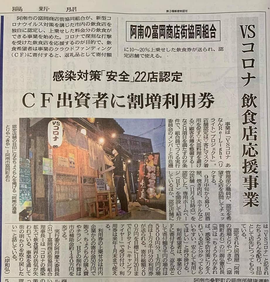 本日の徳島新聞朝刊に、当プロジェクトの取組とクラウドファンディングについて紹介されています!!