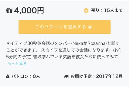2017/08/05 14:50 新たに4000円のリターンを追加しました。 NekaやRozannaとスカイプもしくはラインで15分間会話することができます。 自分の英語を試すのもよし、楽しく会話するのもよしです。 是非彼女たちとの会話を楽しんでください1 ご支援よろしくお願いします! もっと見る