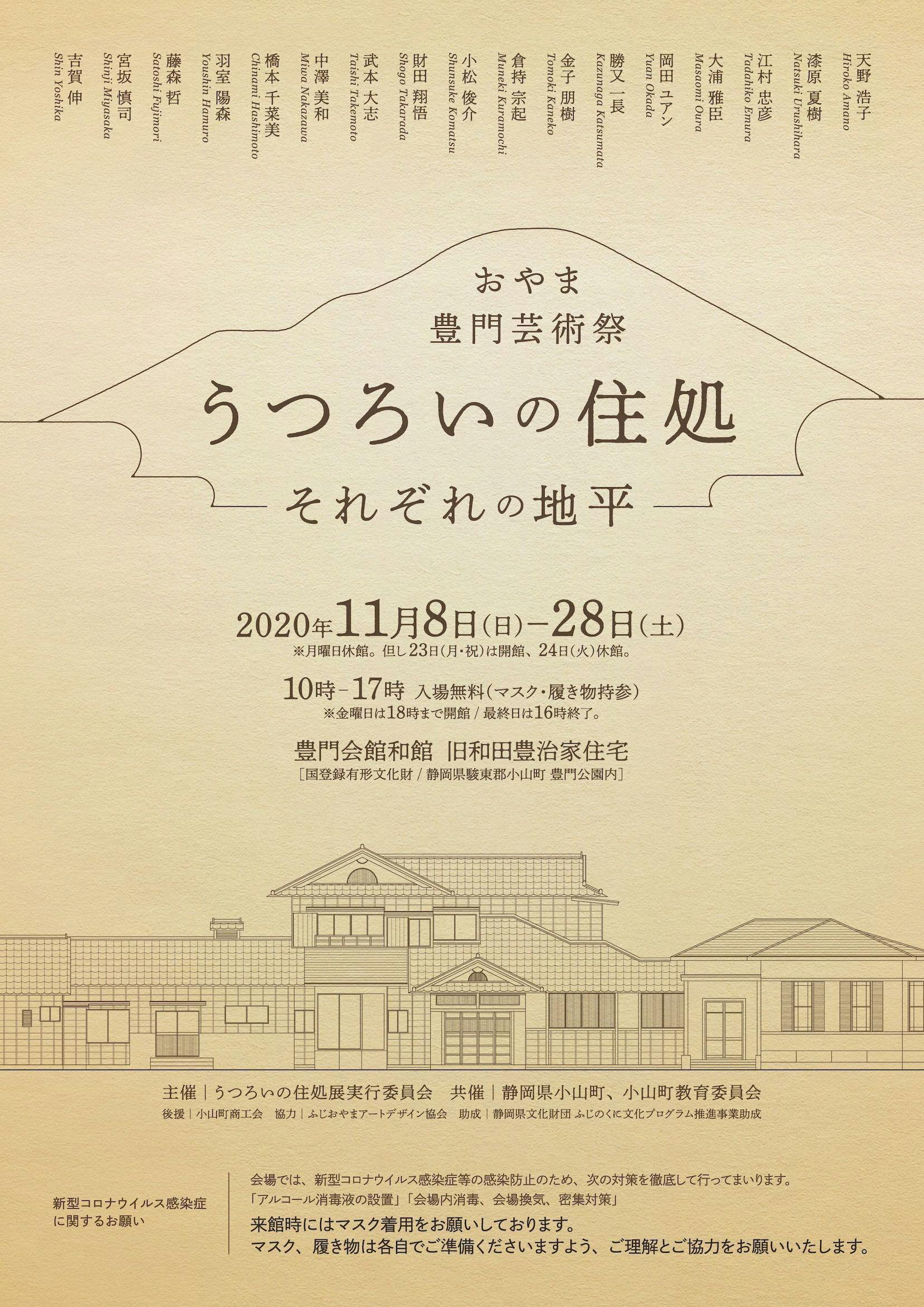 私たち17名の作家は富士の麓にある、豊門会館を舞台に芸術祭を開催いたします。豊門会館は、静岡県駿東郡小山町の豊門公園内にある建物です。豊門会館とは、小山町発祥の紡績会社「富士紡績」(現:富士紡ホールディングス株式会社)の経営危機を救った和田豊治が自身の邸宅を東京から小山町に移築したことで今に伝わります。2019年に豊門会館の改修工事が完了し、2020年同公園内の庭園と西洋館の改修工事が完了し全面的にリニューアルオープンしました。私たち17名の美術作家は純粋に建築空間の魅力に惹かれ、この空間で作品を展示してみたいという思いから展覧会を企画しました。